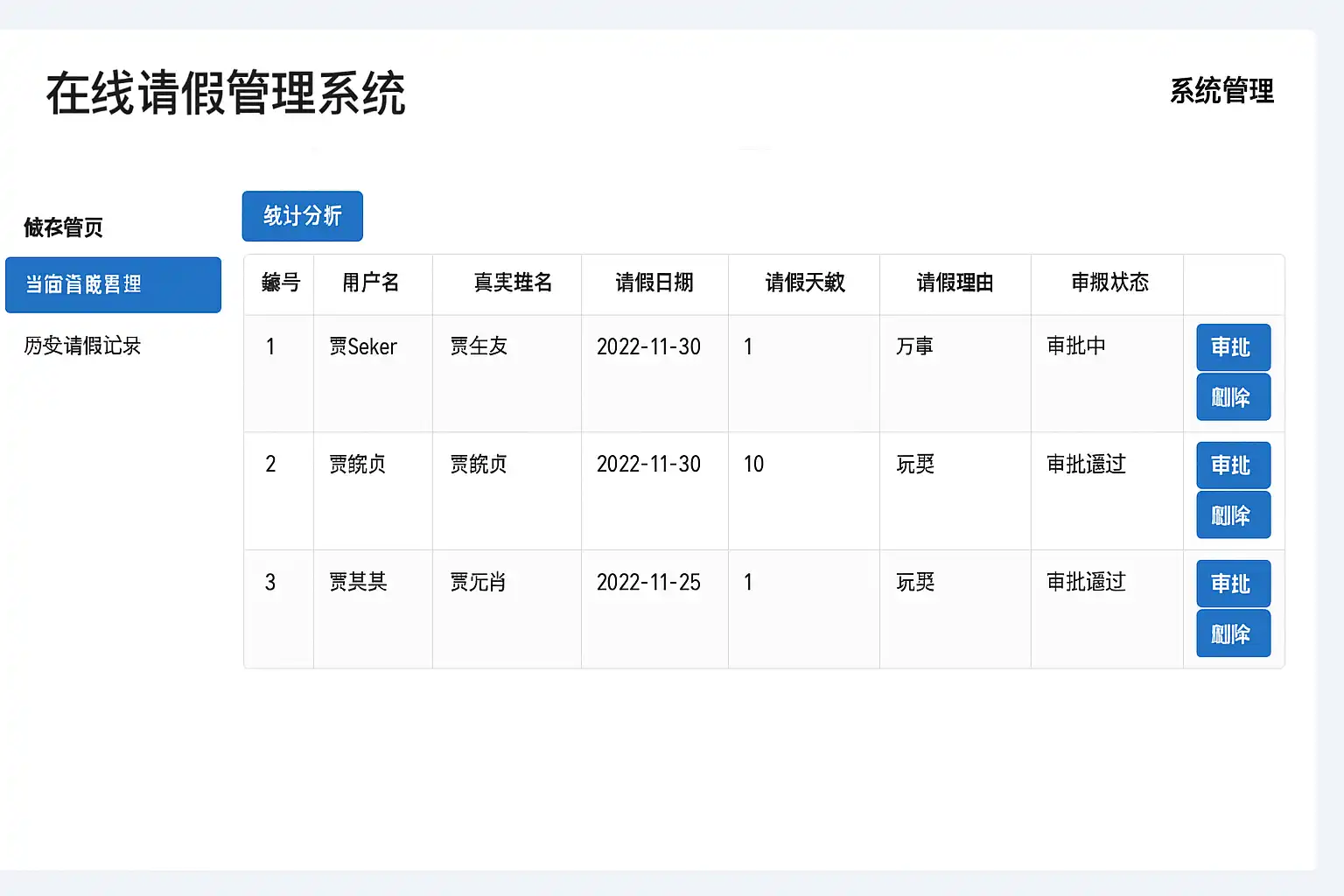 - 数据统计与报表:能实时生成请假数据分析,支持导出CSV或Excel。