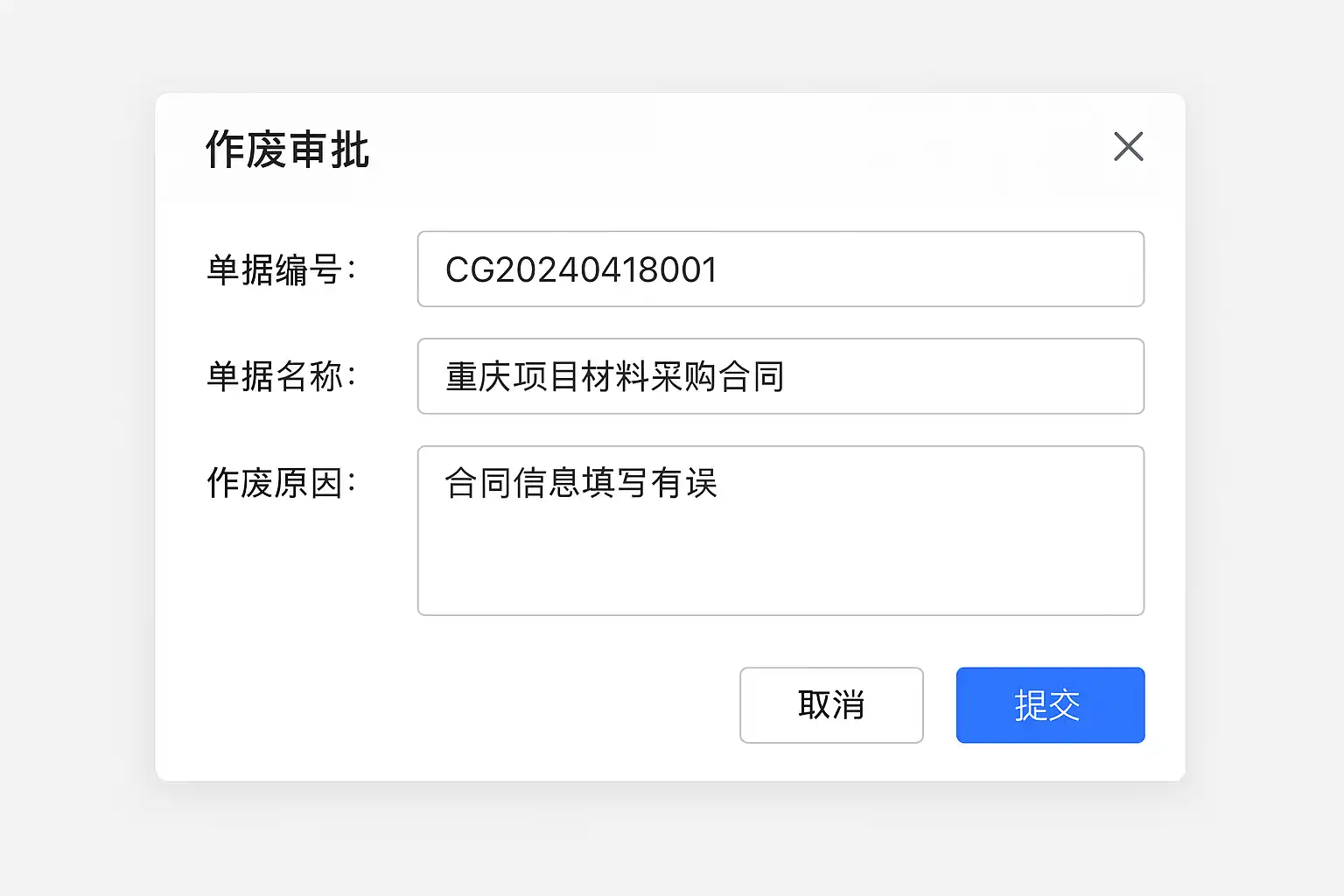 - 提交作废申请:用户在系统中选择需要作废的单据,填写作废原因并提交申请。