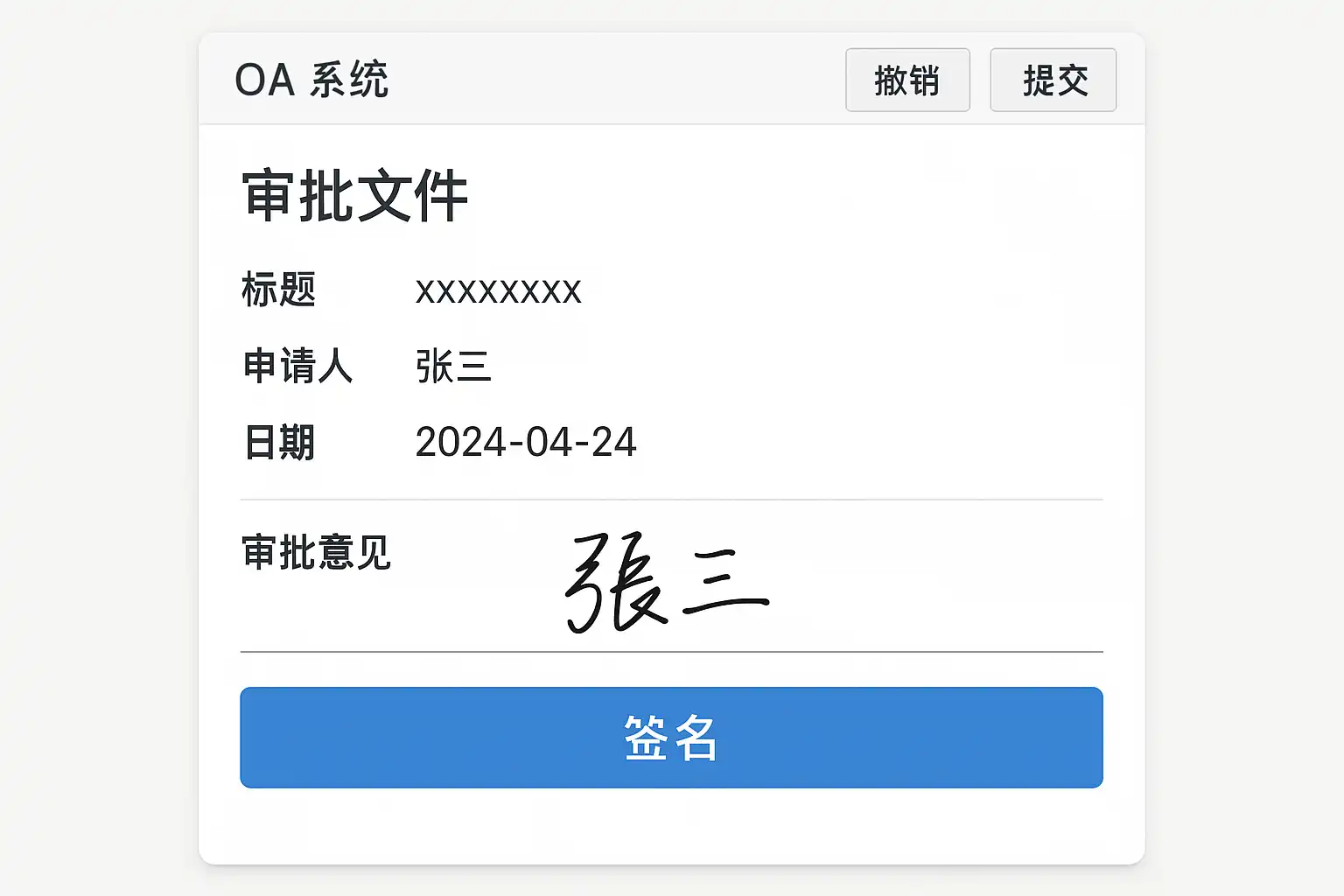| 日常请假/报销 | 手写签名/电子签名 | 便捷优先,真实感或合规均可 |