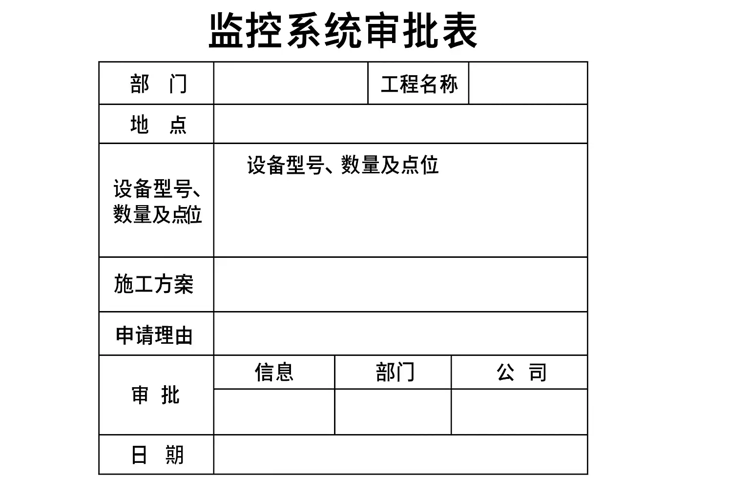 | 监控系统审批表 | 快速录入安装申请、设备清单、审批流自动流转 | 企业、园区、学校等 |