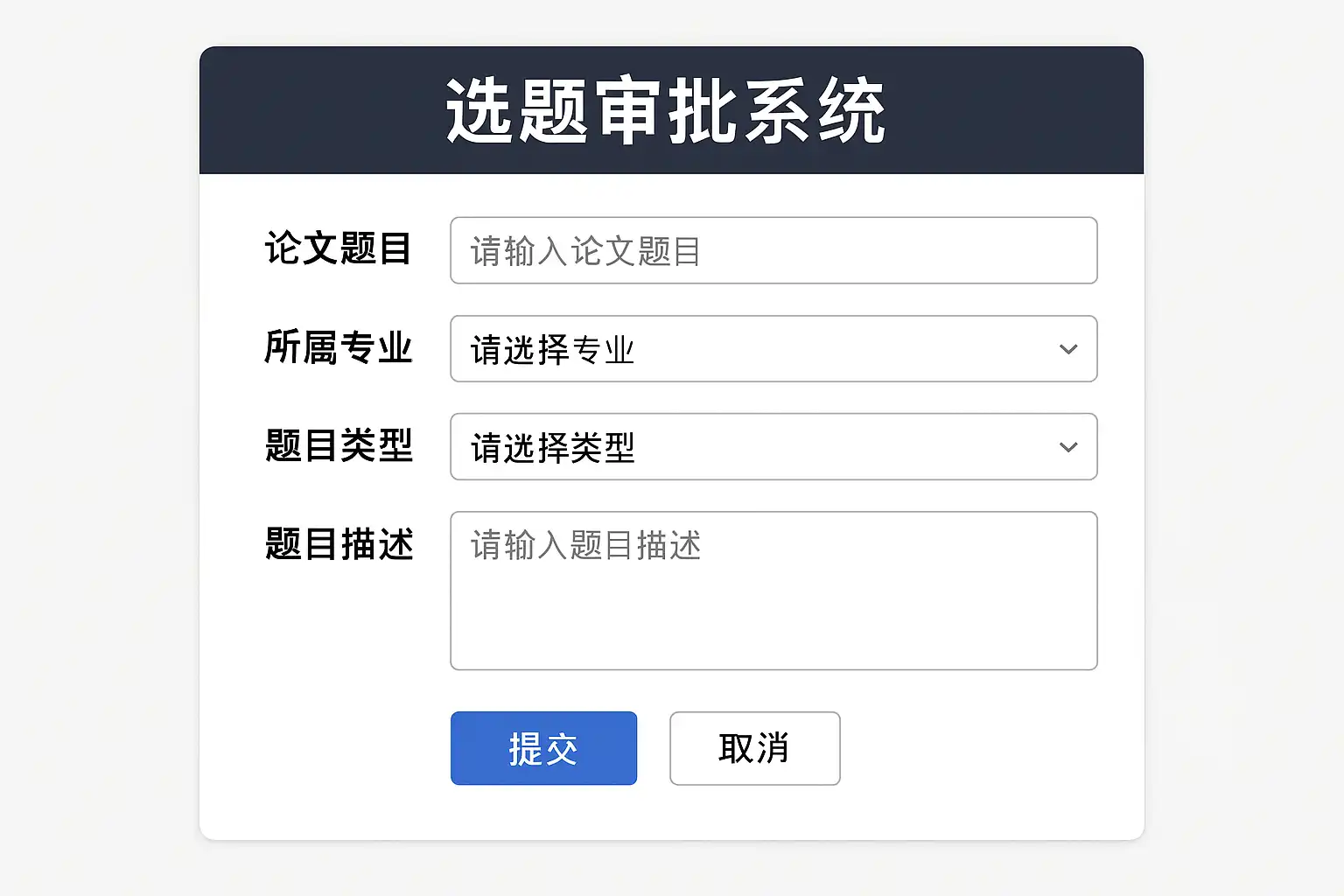 | 选题提交 | 填写表单、上传附件 | 表单校验、自动编号 |