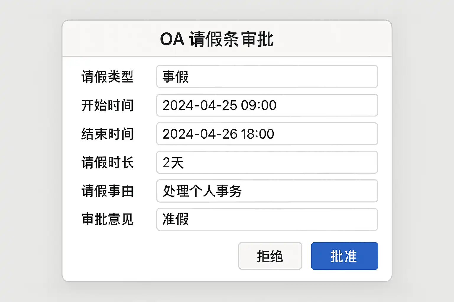 | 状态 (Status) | 当前审批单的处理状态,如待审、通过、驳回 | 请假条状态变为“通过”表示审批完成 |