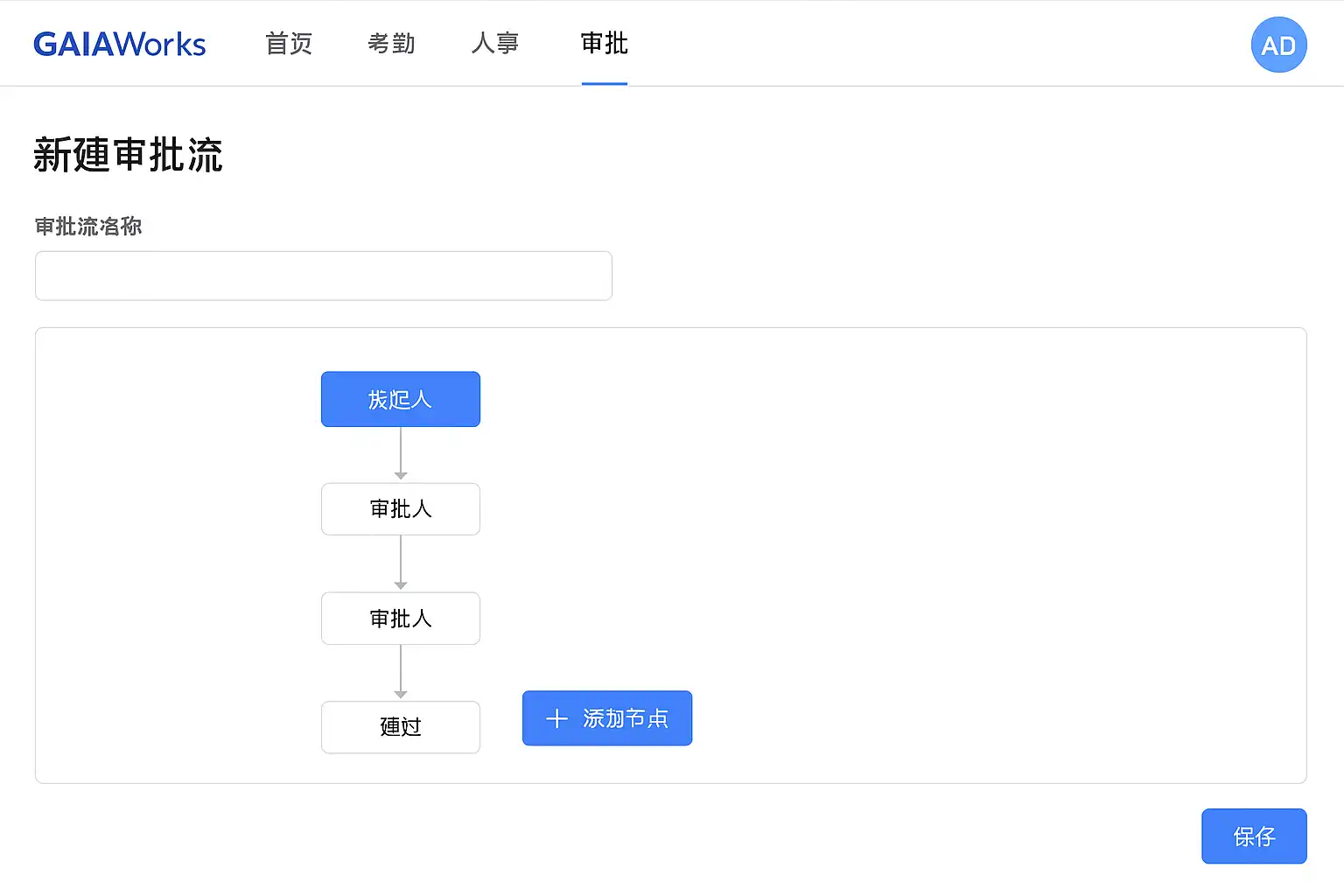 盖雅系统审批流支持“零代码”流程搭建,用户可通过可视化界面完成审批流的设计和部署。下面以典型的请假审批流程为例,详细介绍设置步骤: