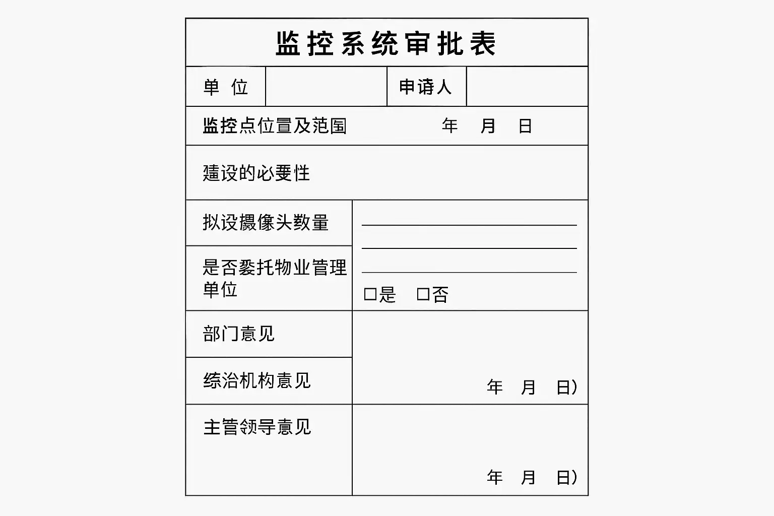 监控系统审批表通常包括以下几个模块,各部分需逐项、准确填写: