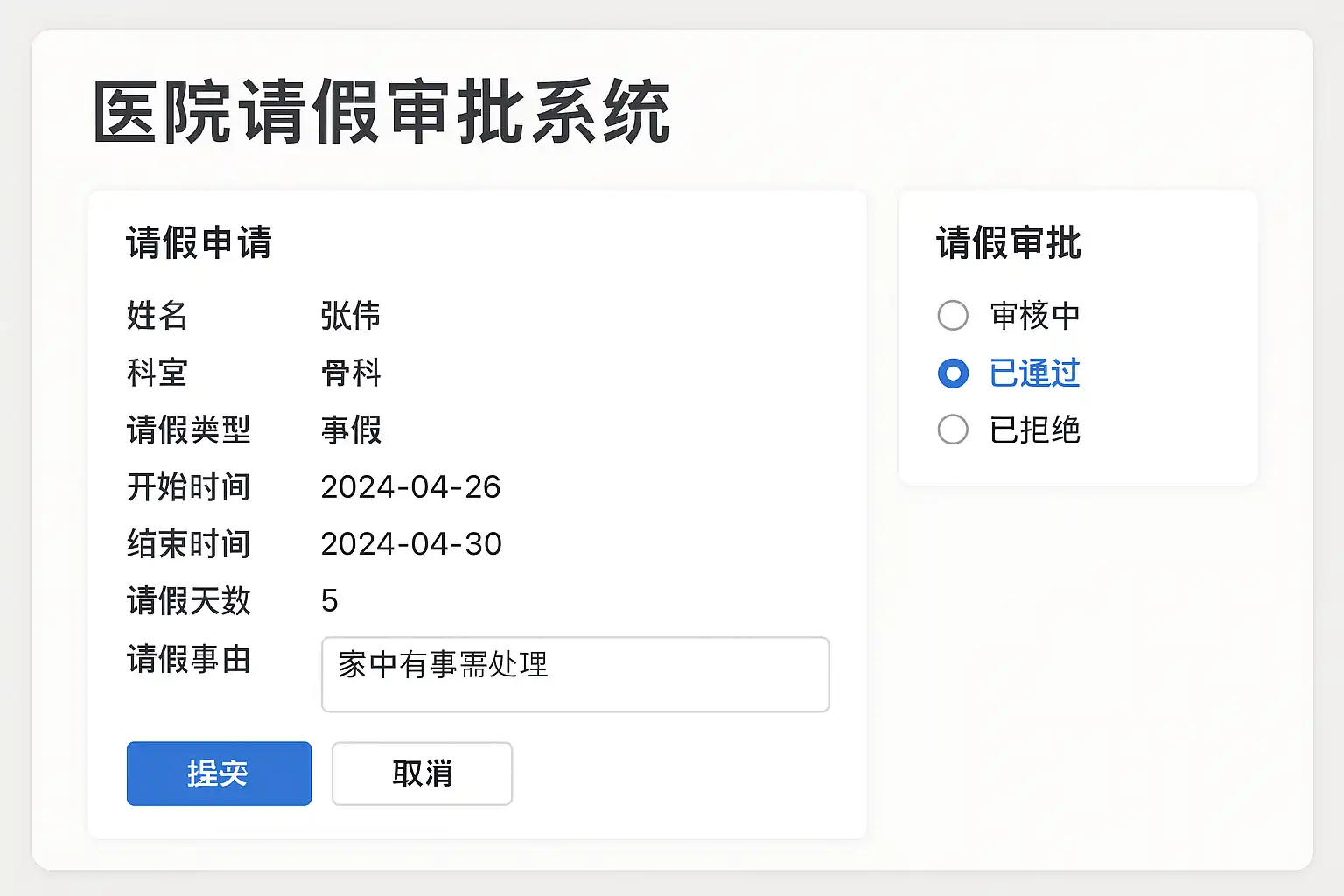技术案例:某三甲医院通过优化请假审批系统,实现申请时间缩短30%,审批通过率提升15%。通过界面简洁设计和自动提醒功能,用户体验显著提升。