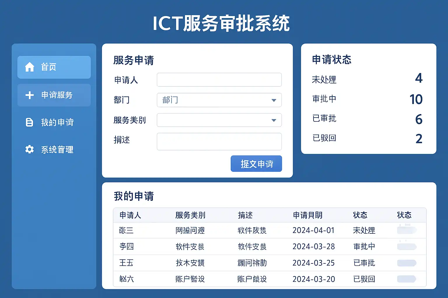 - 实时监控:通过仪表盘展示审批状态,帮助管理者及时掌握进度。 例如,某企业采用ICT服务审批系统后,审批流程从平均5天缩短至3天,效率提升达40%。
