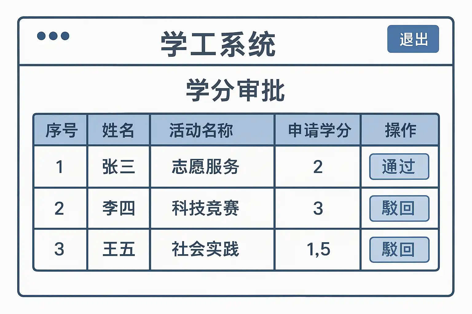 - 学生提交学分申请:通过学工系统上传相关课程或活动证明材料。