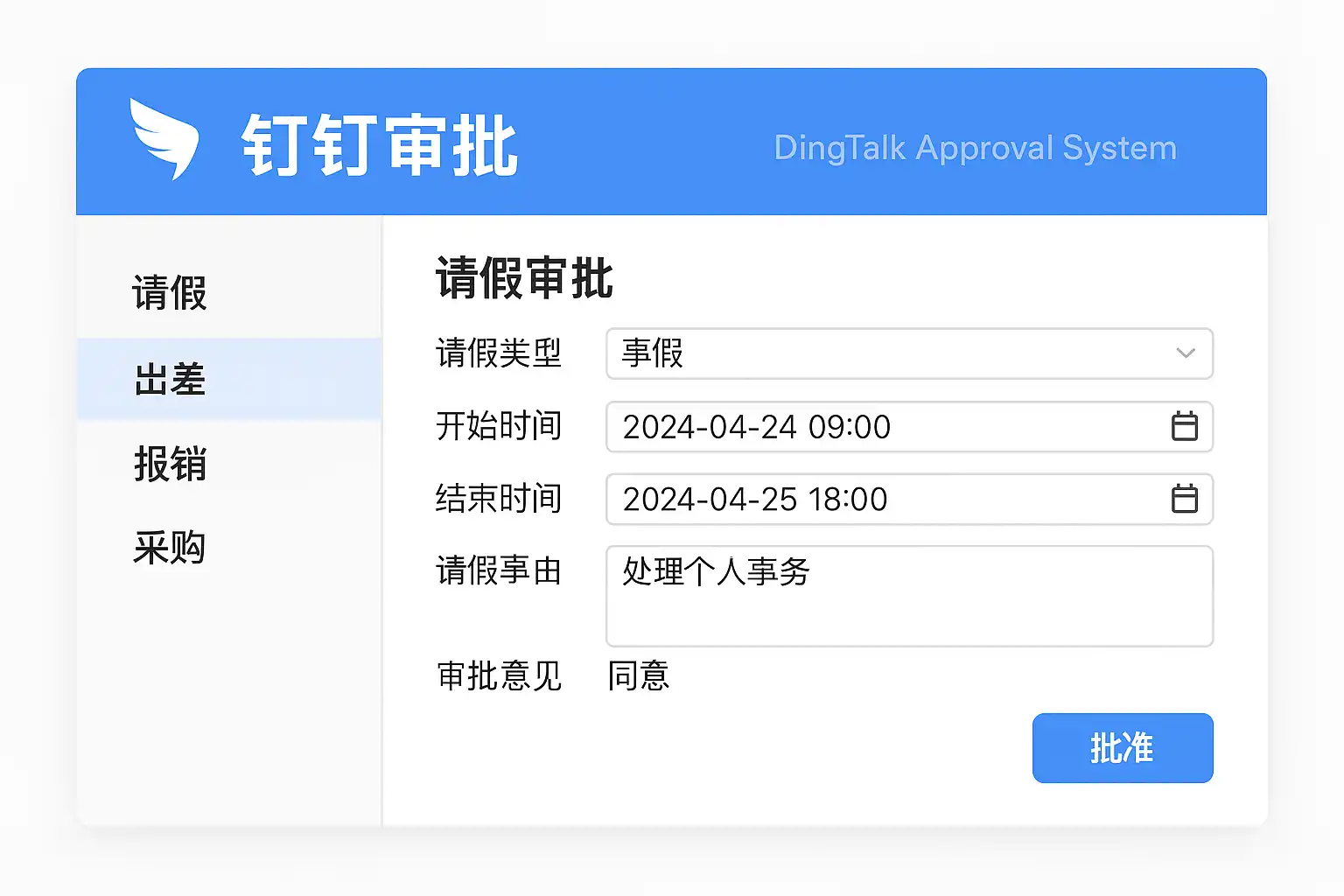 钉钉审批系统支持各类标准和自定义场景,常见应用包括: