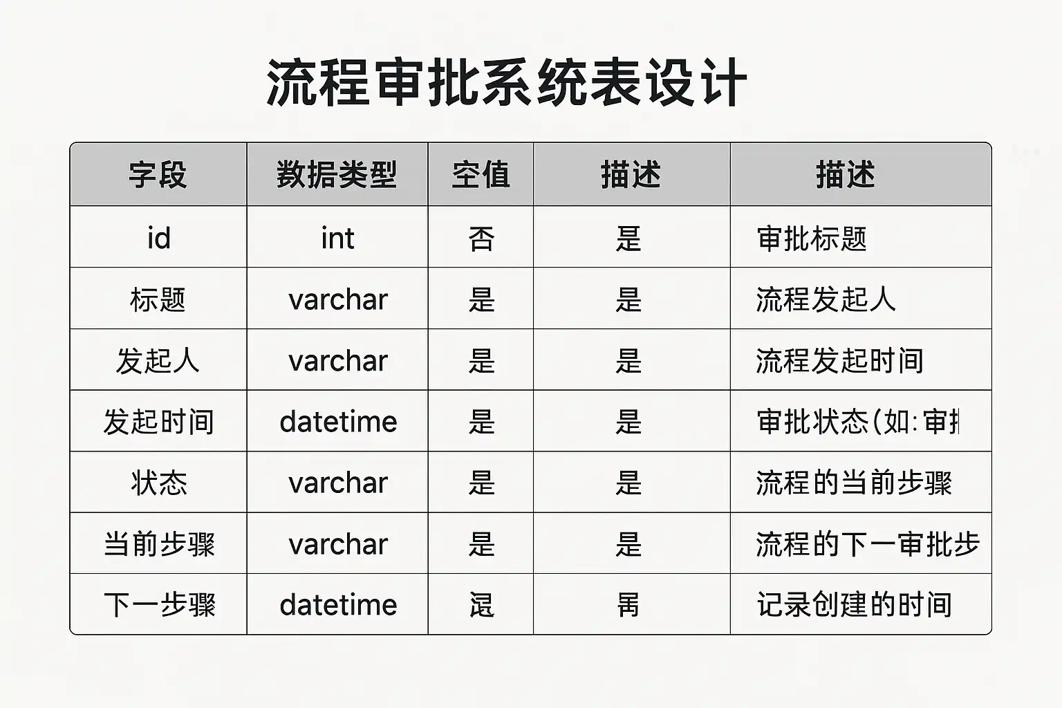 | 流程日志表 | 审批流转、操作行为的详细日志 | log_id, flow_instance_id, 操作, 说明, 时间等 |
