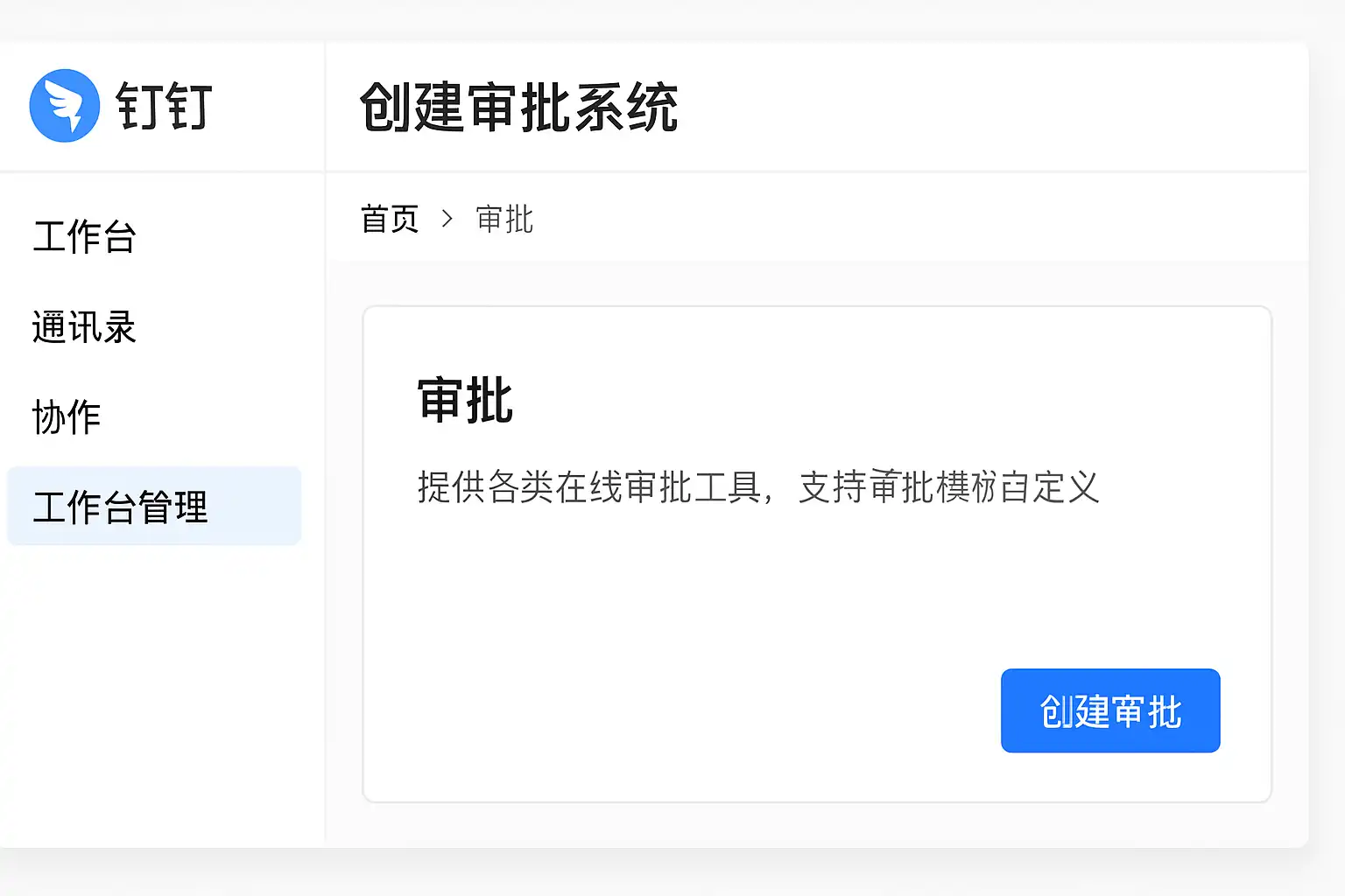 - 登录钉钉管理后台,进入“工作台”中的“审批”模块;