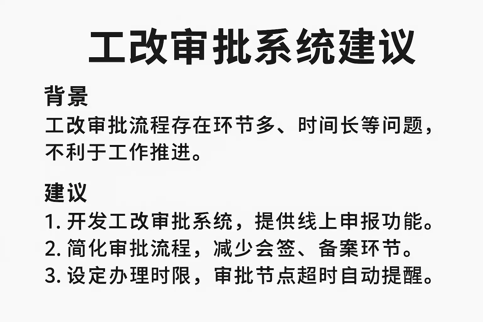 我在准备工改审批系统的建议时,不知道该如何结构化内容,怎样写才能让审批人员快速理解和采纳?有没有实用的写作技巧可以提升建议的通过率?
