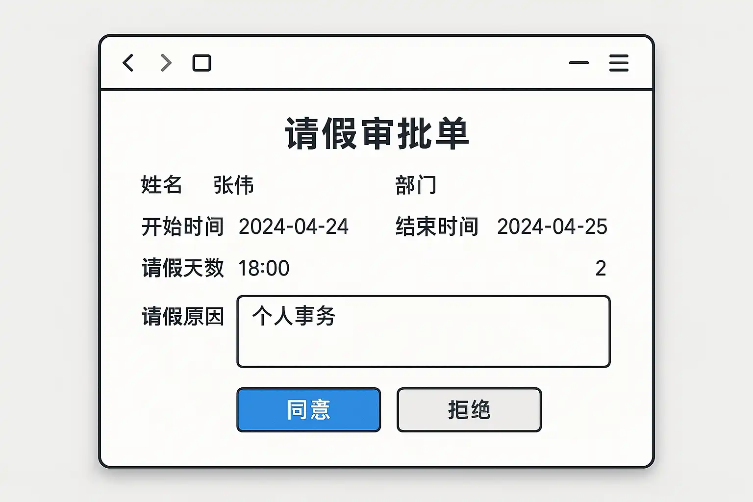 | 表单字段 | 请假类型、开始结束时间、请假天数、请假原因等 |