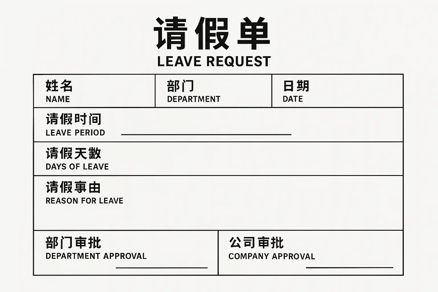| 字段编辑 | 拖拽式添加姓名、部门、请假类型、时间等字段 | 支持自定义必填项与校验规则 |