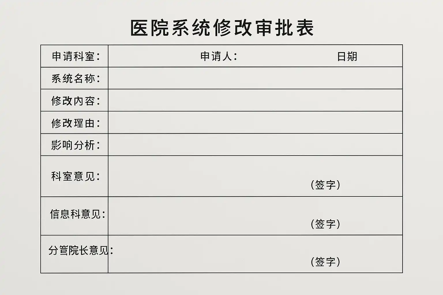医院系统修改审批表是医院信息系统变更管理的核心文档,主要用于规范和记录系统修改事项,确保修改有据可查、过程受控、风险可控。其基本结构包括以下几个部分: