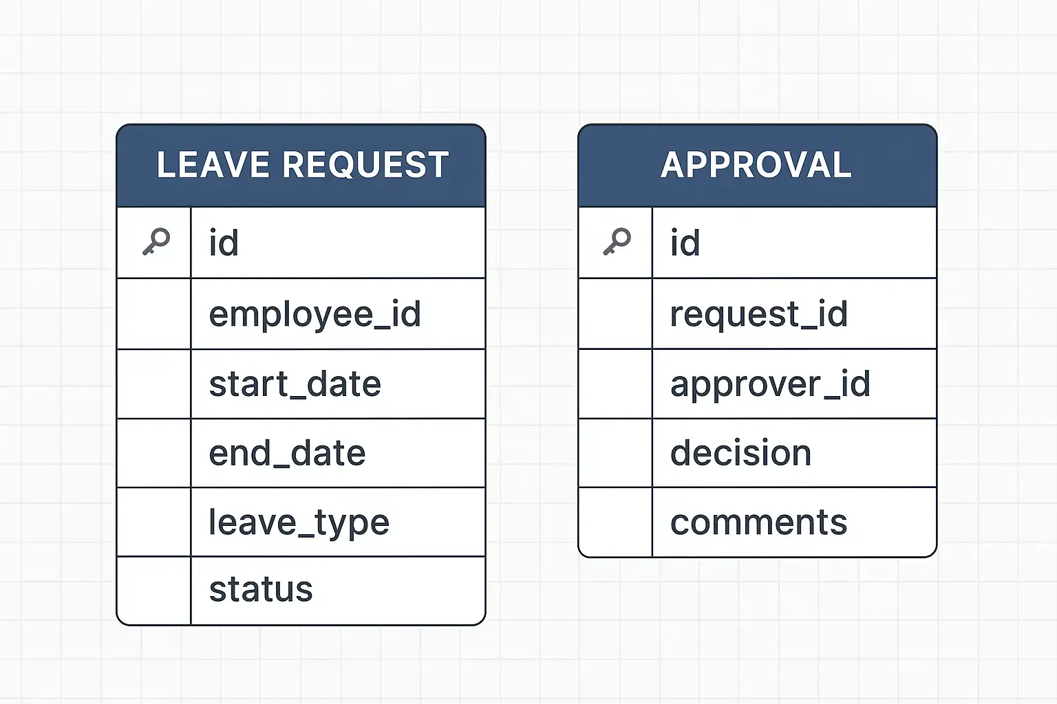 这种设计确保每条请假申请可以对应多条审批记录,支持多级审批和流程追踪。