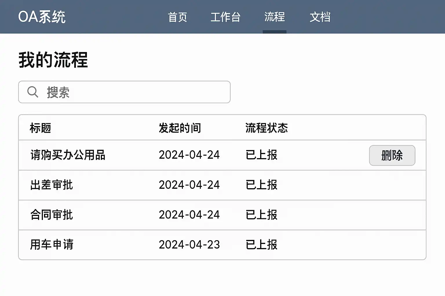 以主流OA系统(如简道云零代码OA)为例,删除已上报流程通常分为以下步骤:
