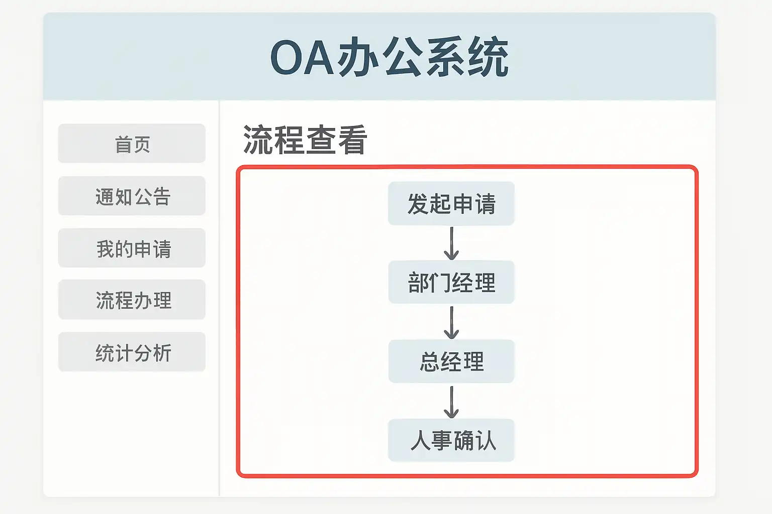 流程图是OA办公系统中直观展示流程步骤和节点的工具,帮助用户快速理解流程的整体结构和逻辑顺序。优势包括: