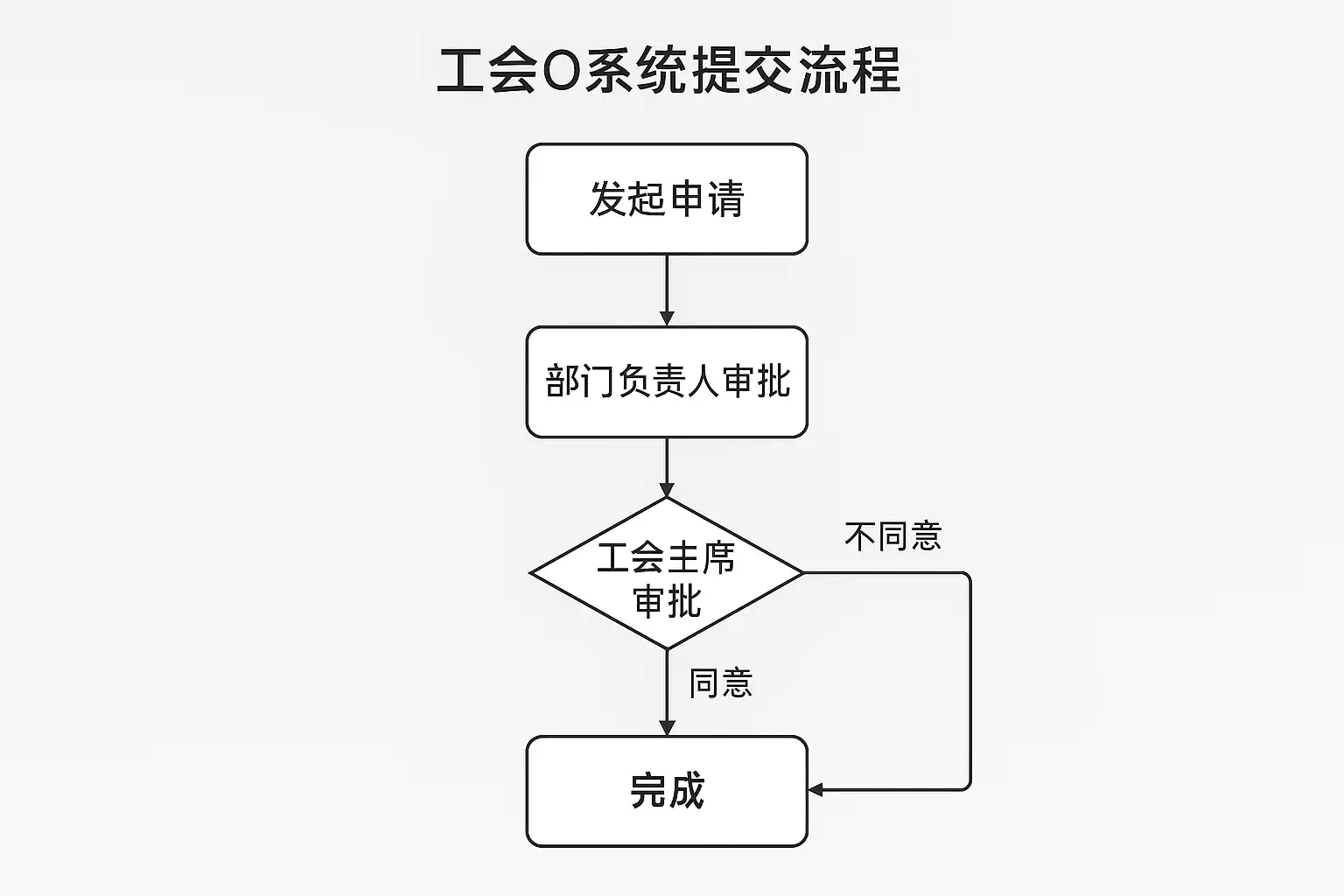 流程发起是工会OA系统的第一步。用户根据权限登录系统,选择要发起的具体事项(如活动审批、经费申请、会员管理等)。