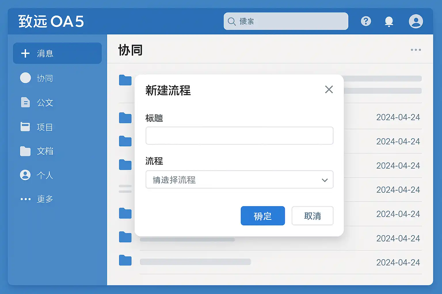 企业通过致远OA5代系统的新建流程,可以快速搭建符合自身管理需求的数字化办公平台,实现降本增效、协同创新。