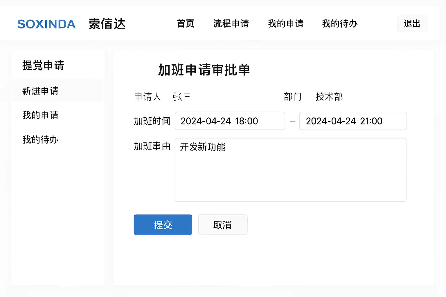 索信达OA系统加班流程依托系统化的表单和审批流,确保操作的规范性和透明度。流程主要分为以下几个步骤: