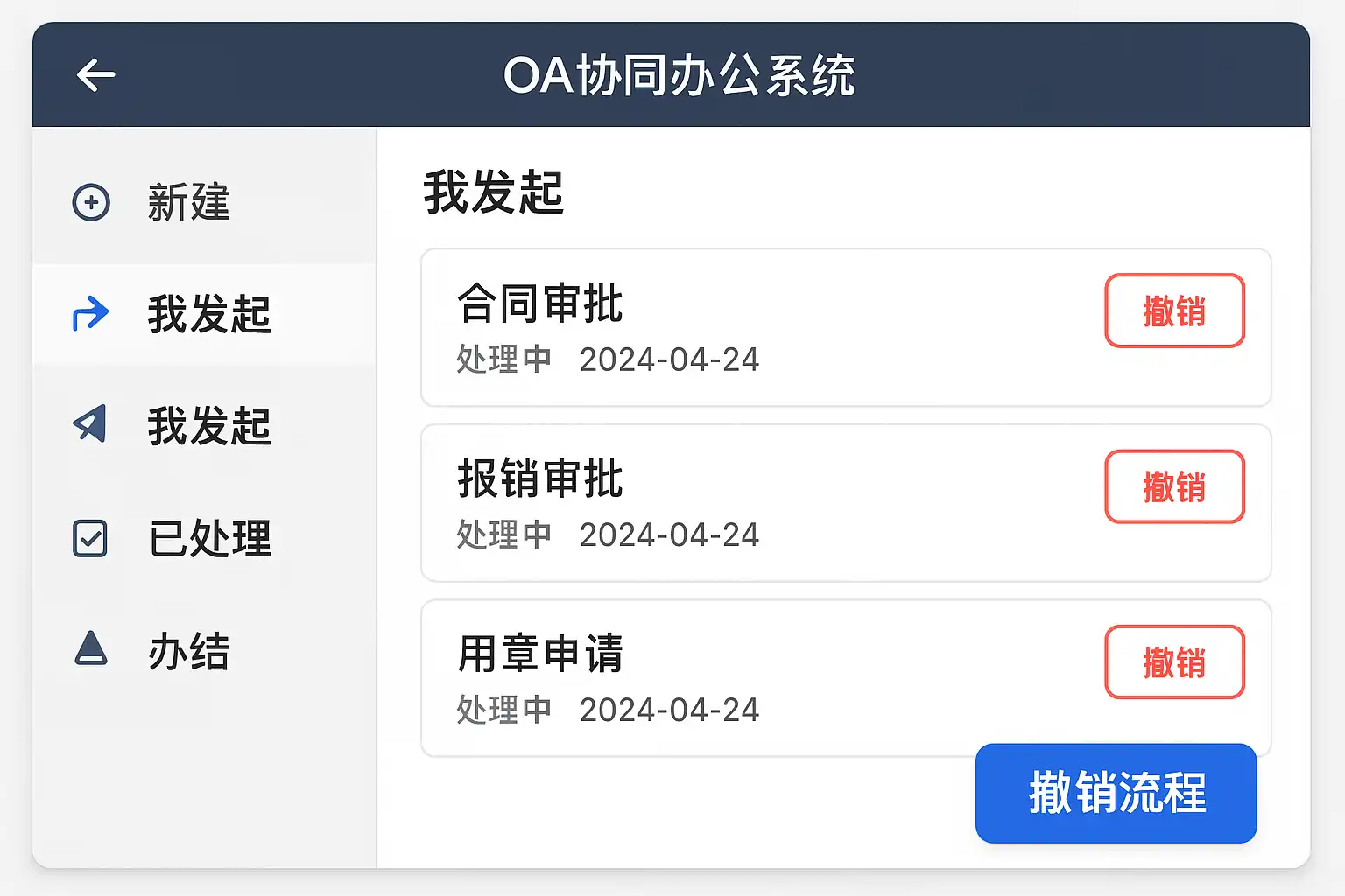 OA(Office Automation)协同办公系统以流程自动化、数据共享与高效协作为目标,是现代企业日常管理与决策支持的基础平台。在企业日常运营中,审批流程的发起与撤销是高频需求,确保流程的可控性与灵活性。撤销流程指的是将已提交但尚未最终完成审批的单据,从流程流转节点中撤回,以便修改或终止。
