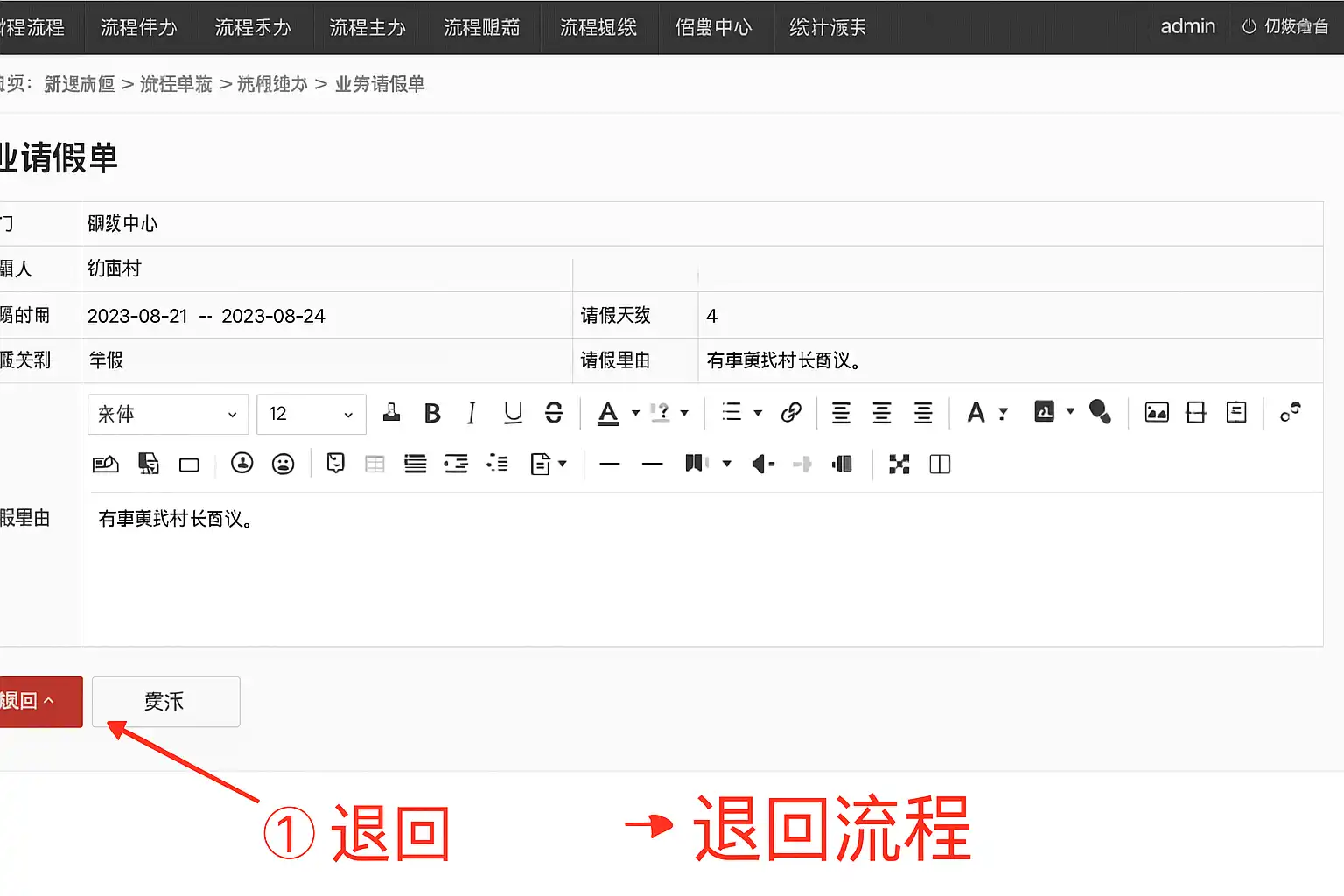| 流程留痕与日志 | 自动记录退回时间、原因、操作人、节点等,利于流程透明与责任追溯。 | 系统显示退回操作日志 |