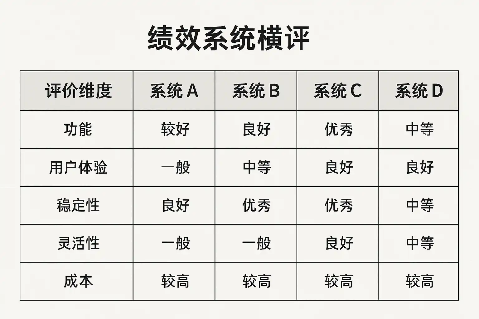 以下是绩效系统横评模板的应用示例,适用于企业选型或内控优化场景: