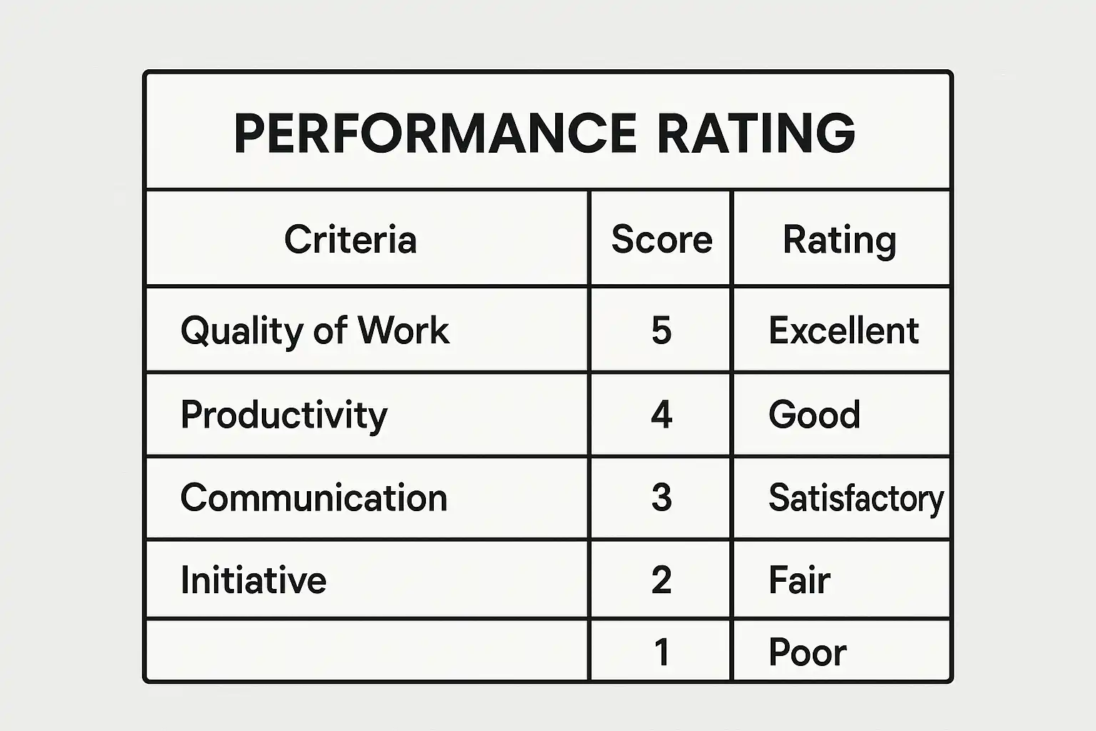 - 采用五级评分法(如:优秀、良好、合格、待改进、不合格)