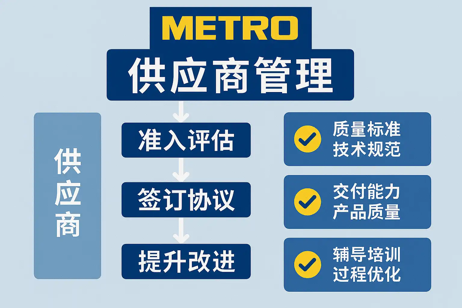 - 持续改进:定期召开供应商会议,基于数据反馈推动流程优化。 通过这套系统化流程,麦德龙能有效提升供应商合作质量和响应速度。