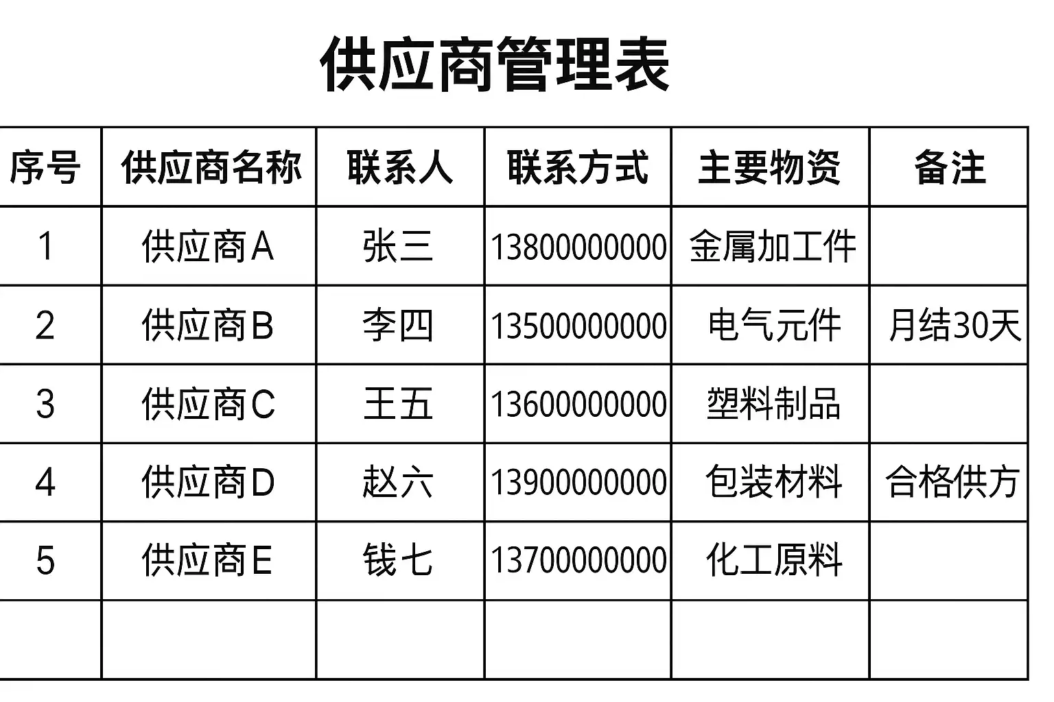 供应商管理表格主要包含供应商基本信息、资质证书、合作历史、产品类别和评估结果等关键字段。填写时应注意: