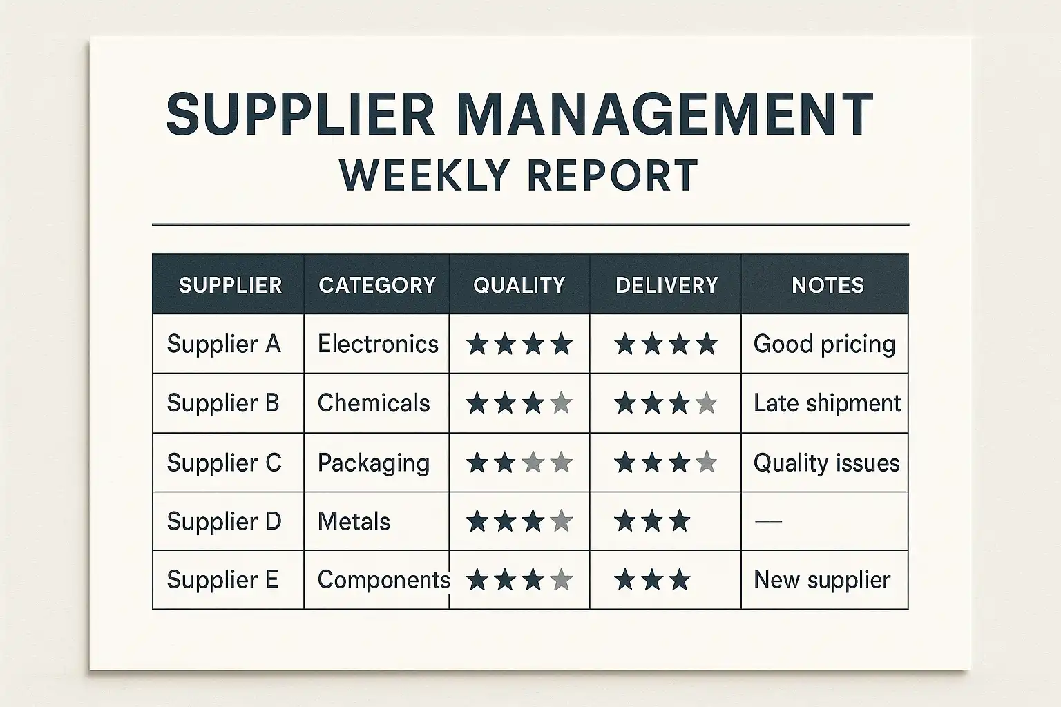 - 案例:某企业将交付及时率和质量合格率放入周报,通过柱状图对比不同供应商表现,帮助采购团队快速决策。