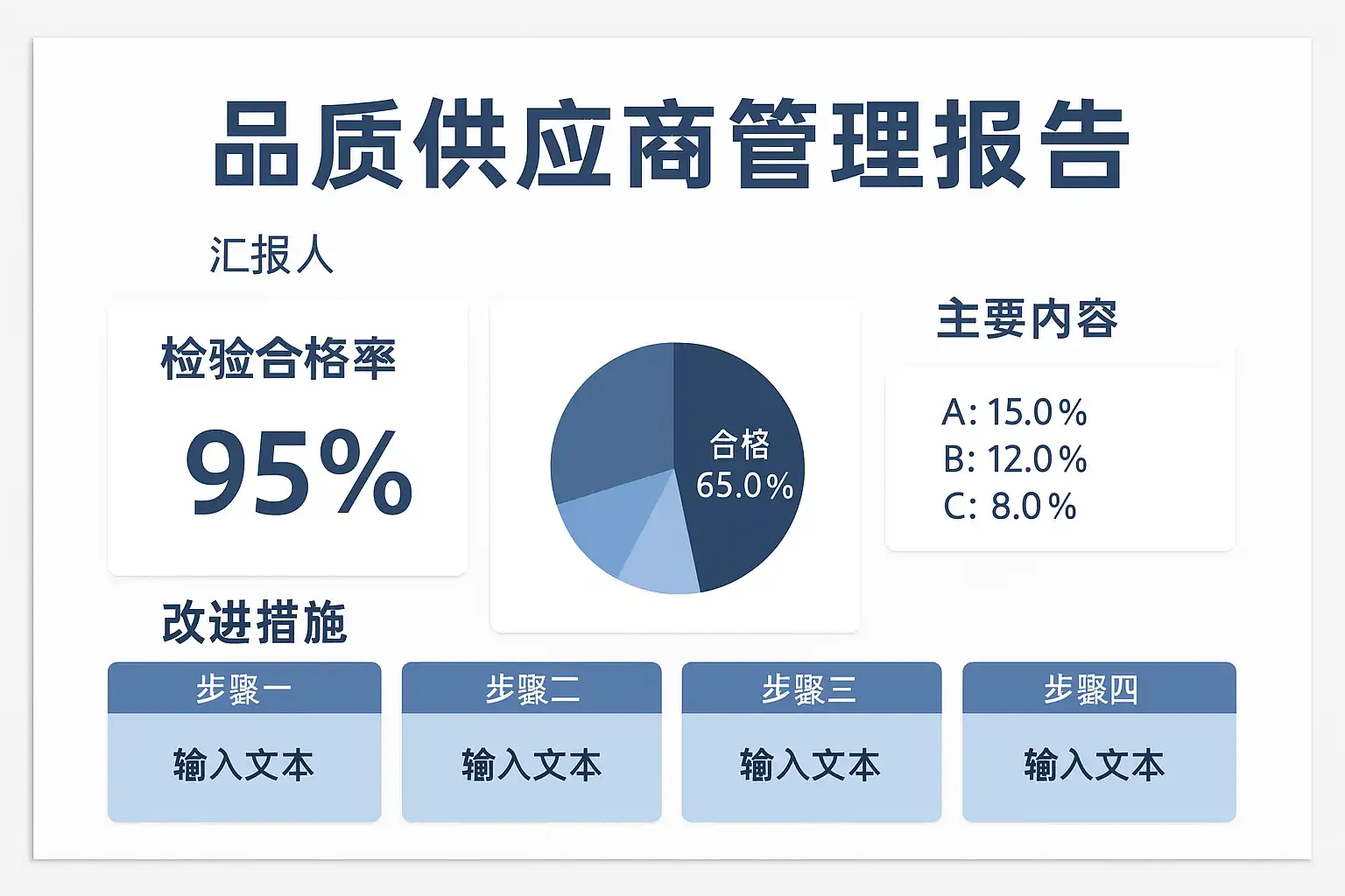- 未来计划与建议:规划后续管理策略和优化方向。 采用这种结构不仅符合SEO关键词“品质供应商管理报告PPT”,还能使内容层次分明,便于观众理解和记忆。