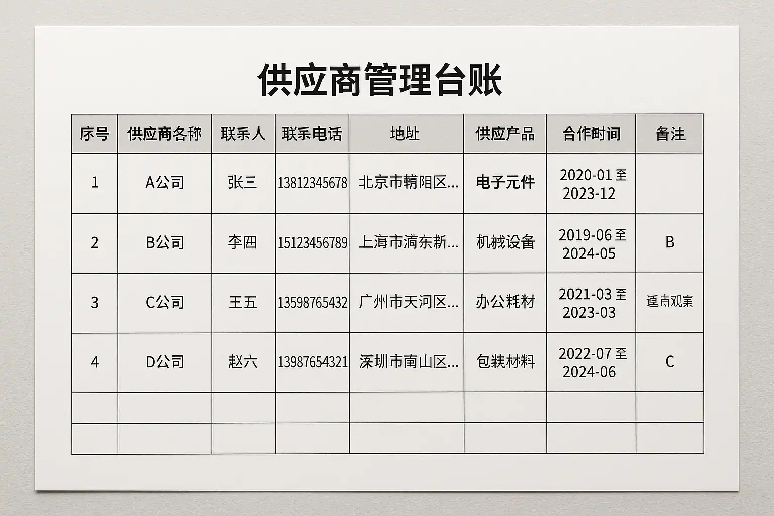 供应商管理台账是企业为实现高效采购管理、风险控制和合规经营而建立的信息数据库。其核心作用和基本架构如下: