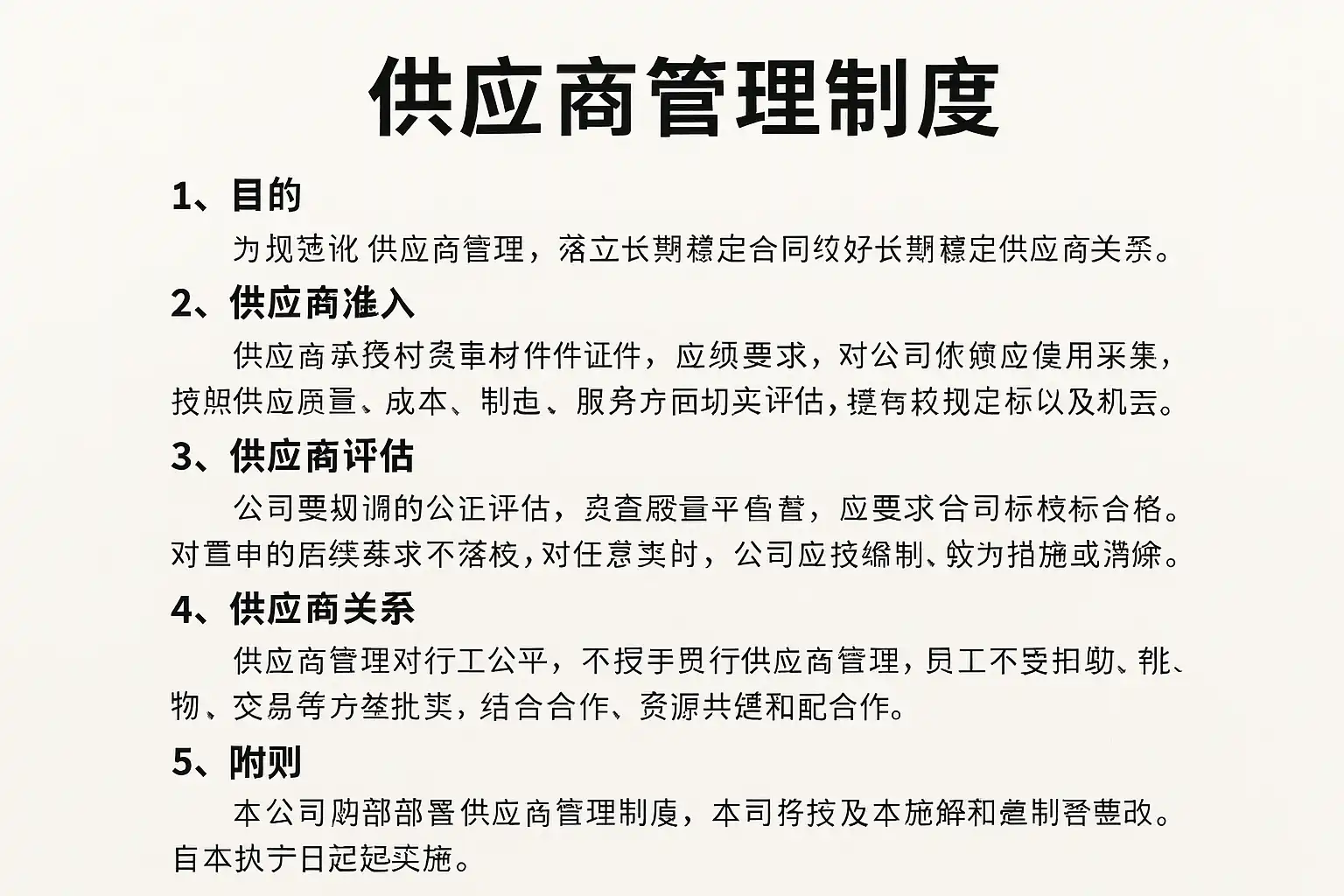 我最近负责制定公司的供应商管理制度,但不太确定应该包含哪些核心内容和结构,怎样才能写得规范又全面?有没有具体的模板或者必须涵盖的要点?