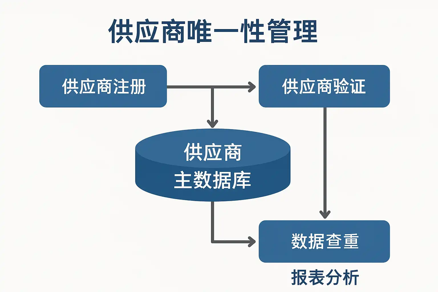 | 唯一性识别 | 保证唯一供应商主档,便于统一管理 | 重复供应商、假冒供应商 |