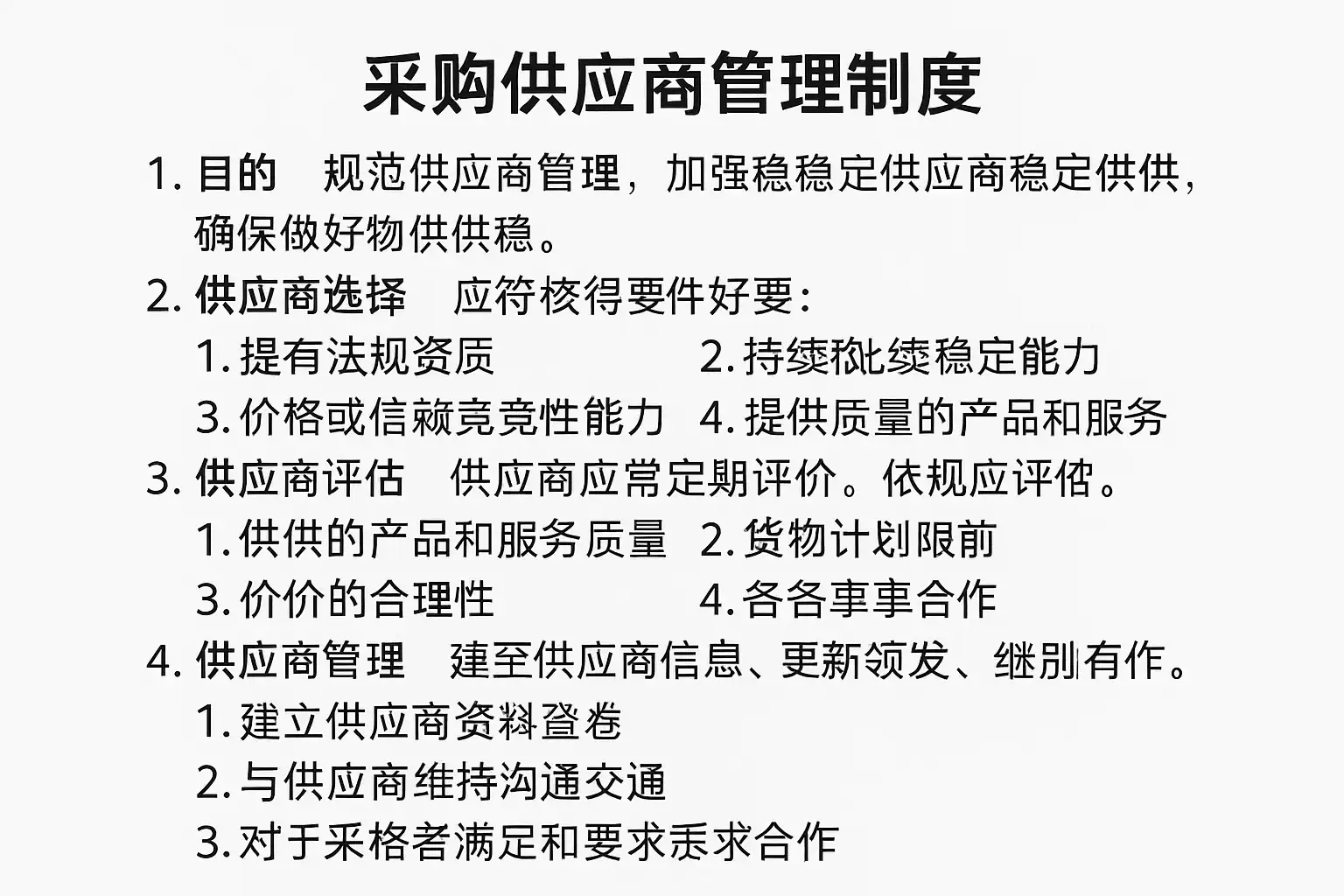 - 供应商准入标准:资质审核、信用评估、合规性检查。