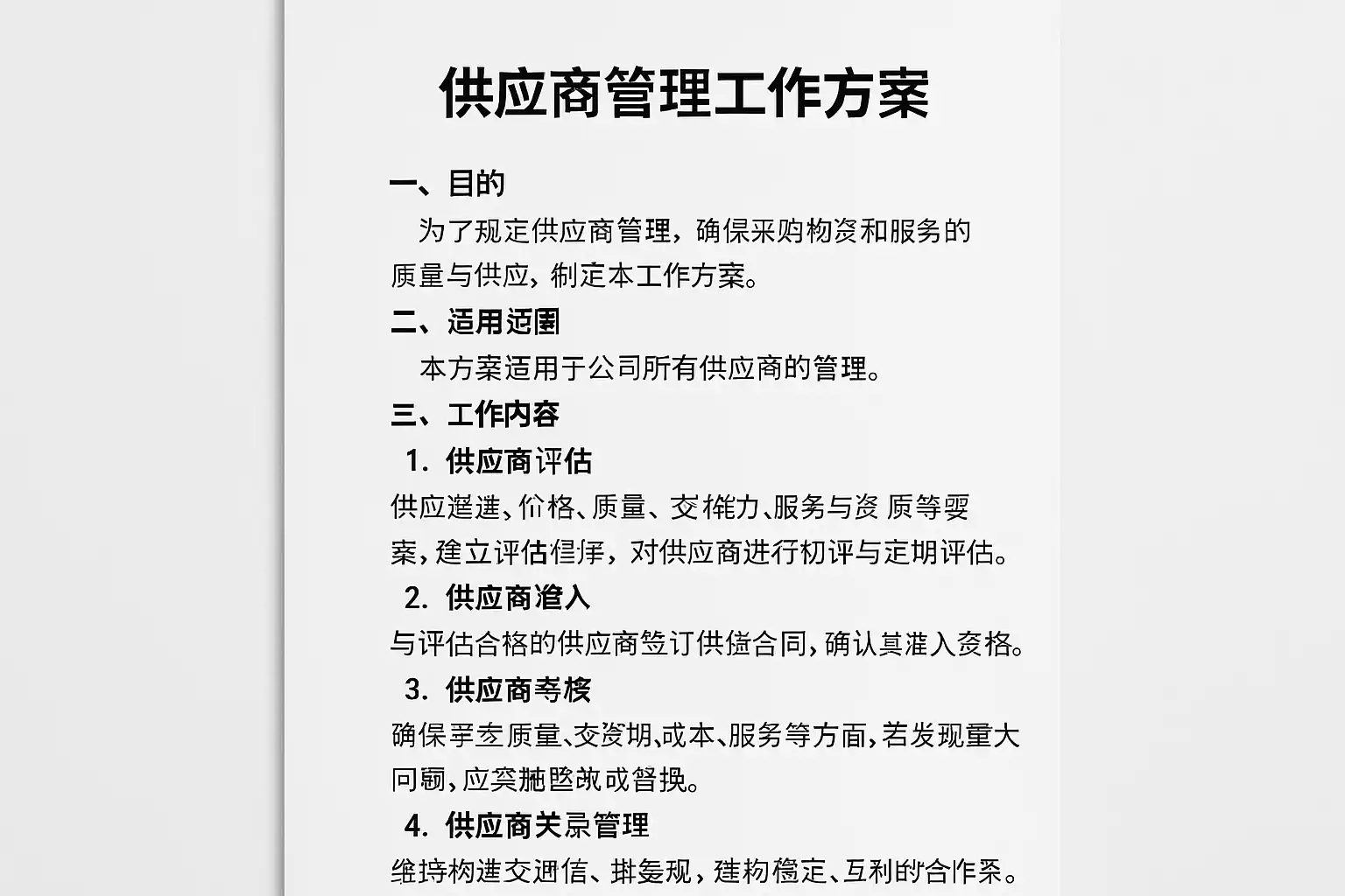 我最近被要求制定一份供应商管理工作方案,但不太清楚方案的核心内容具体包含哪些方面。想知道在写供应商管理方案时,必须重点涵盖哪些内容才能确保方案完整且实用?