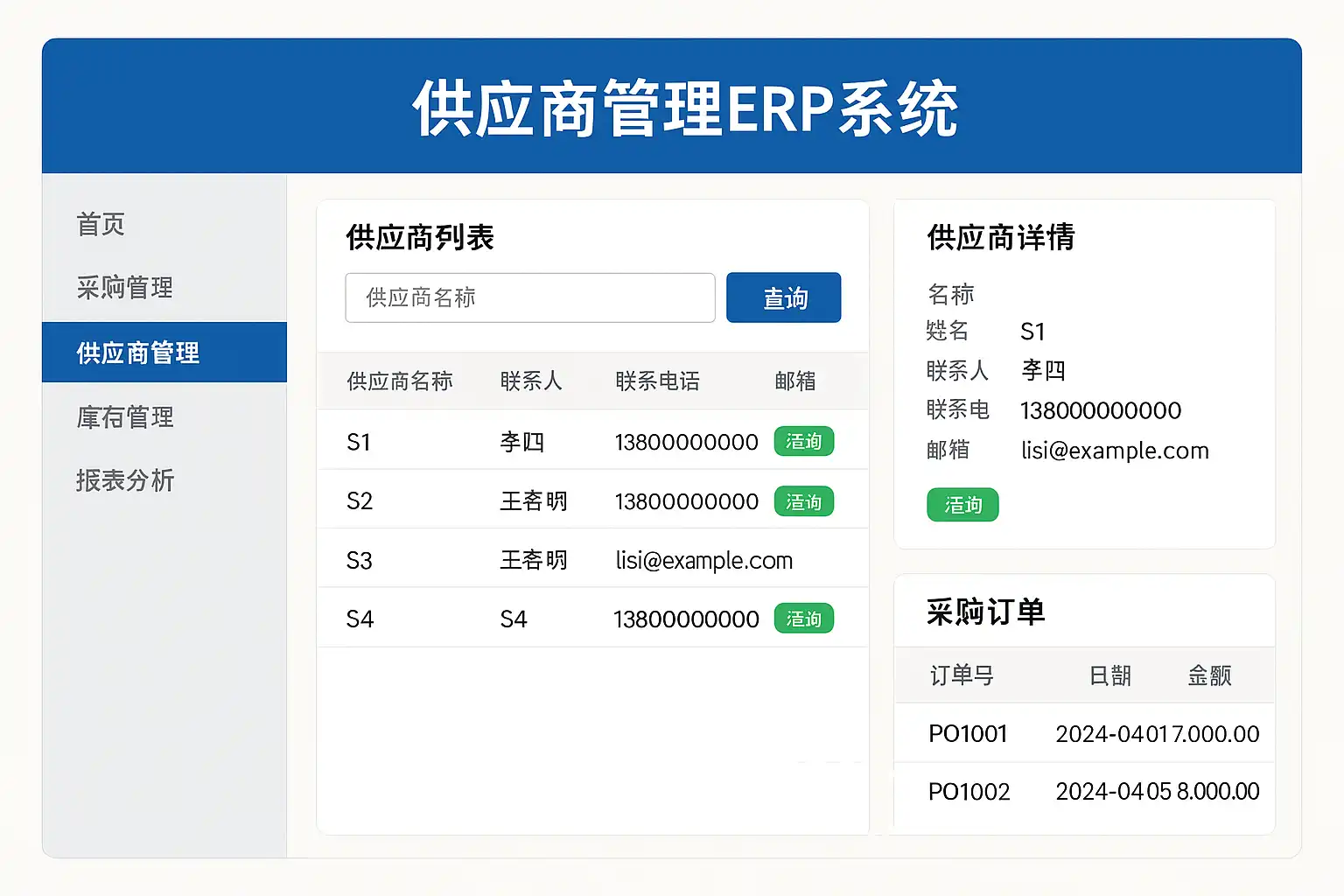 供应商管理ERP系统通过自动化采购流程、实时供应商绩效评估和库存优化,显著提升企业采购效率。关键功能模块包括: