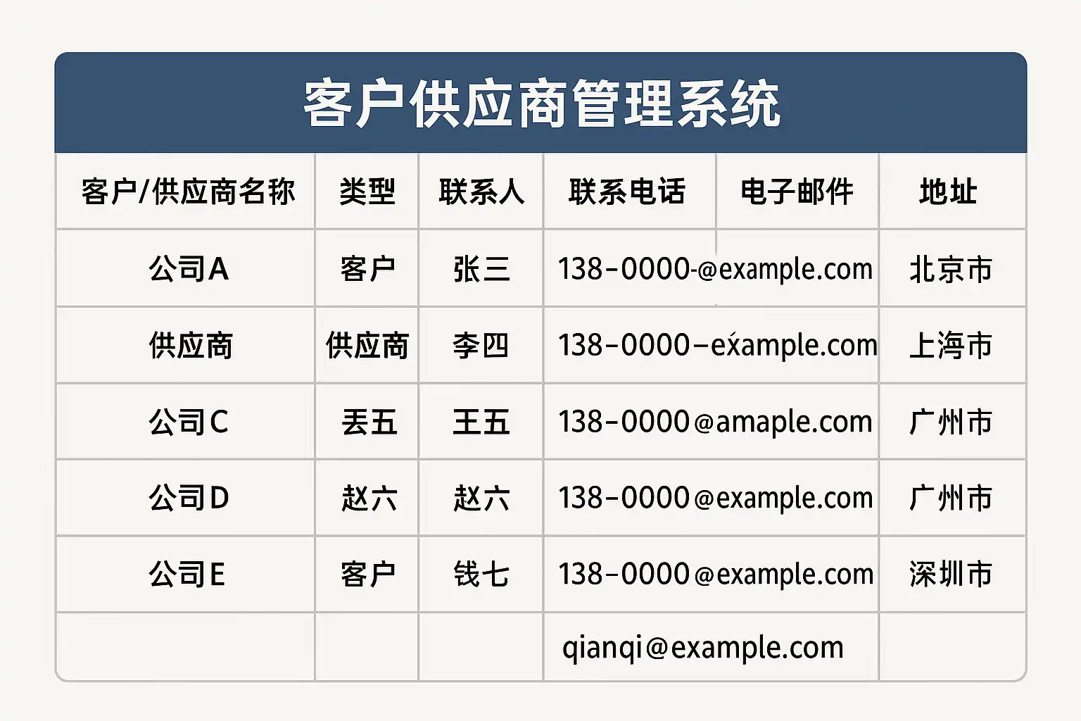 - 将客户和供应商信息分门别类,例如基本信息、历史交易、合规文档、绩效评价等,每类信息单独制表。
