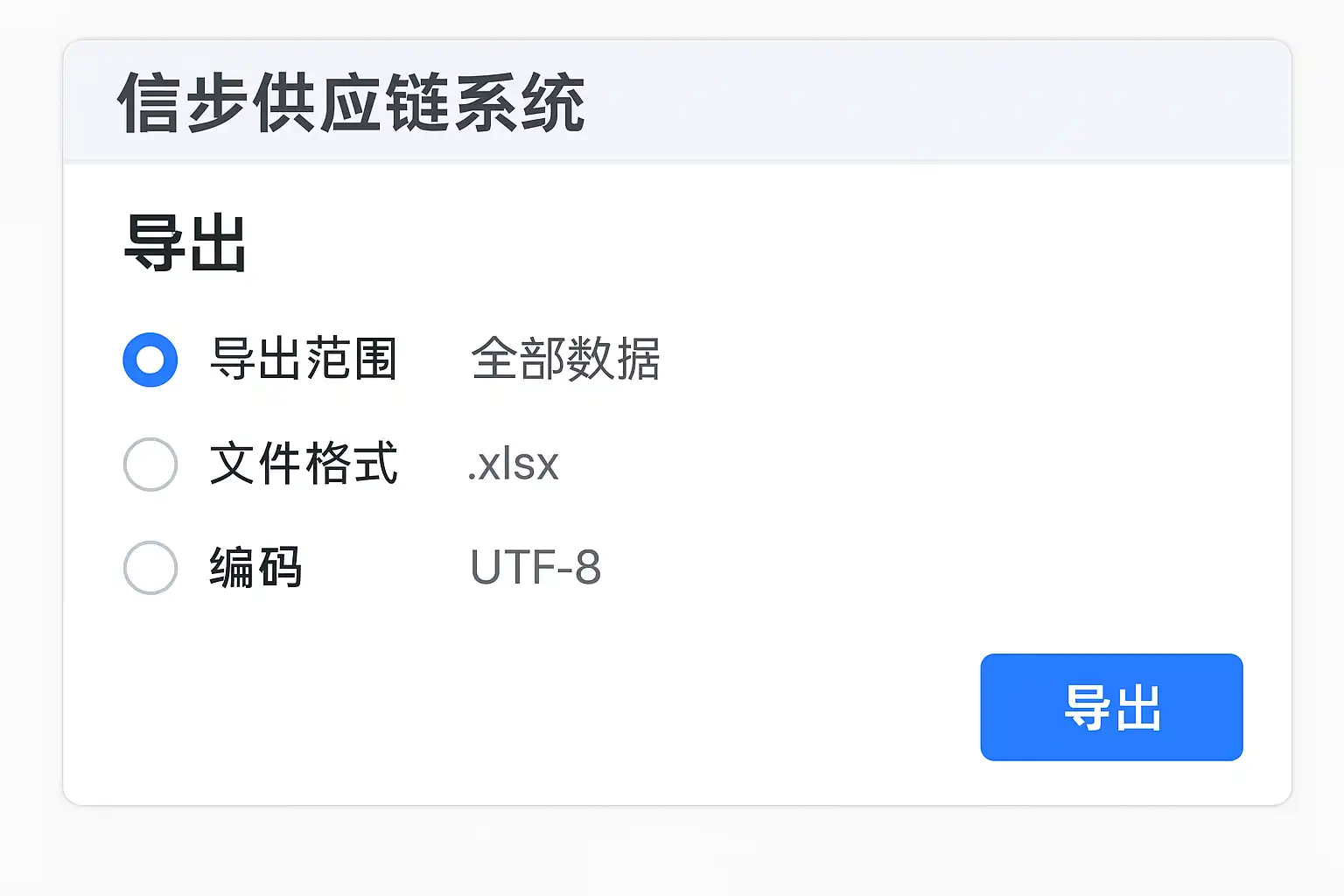 背景解释: 信步供应链系统通常采用分模块管理,数据按采购、销售、库存等业务分区存储。明确目标模块有助于提高导出效率,避免因误选导致无用数据导出。