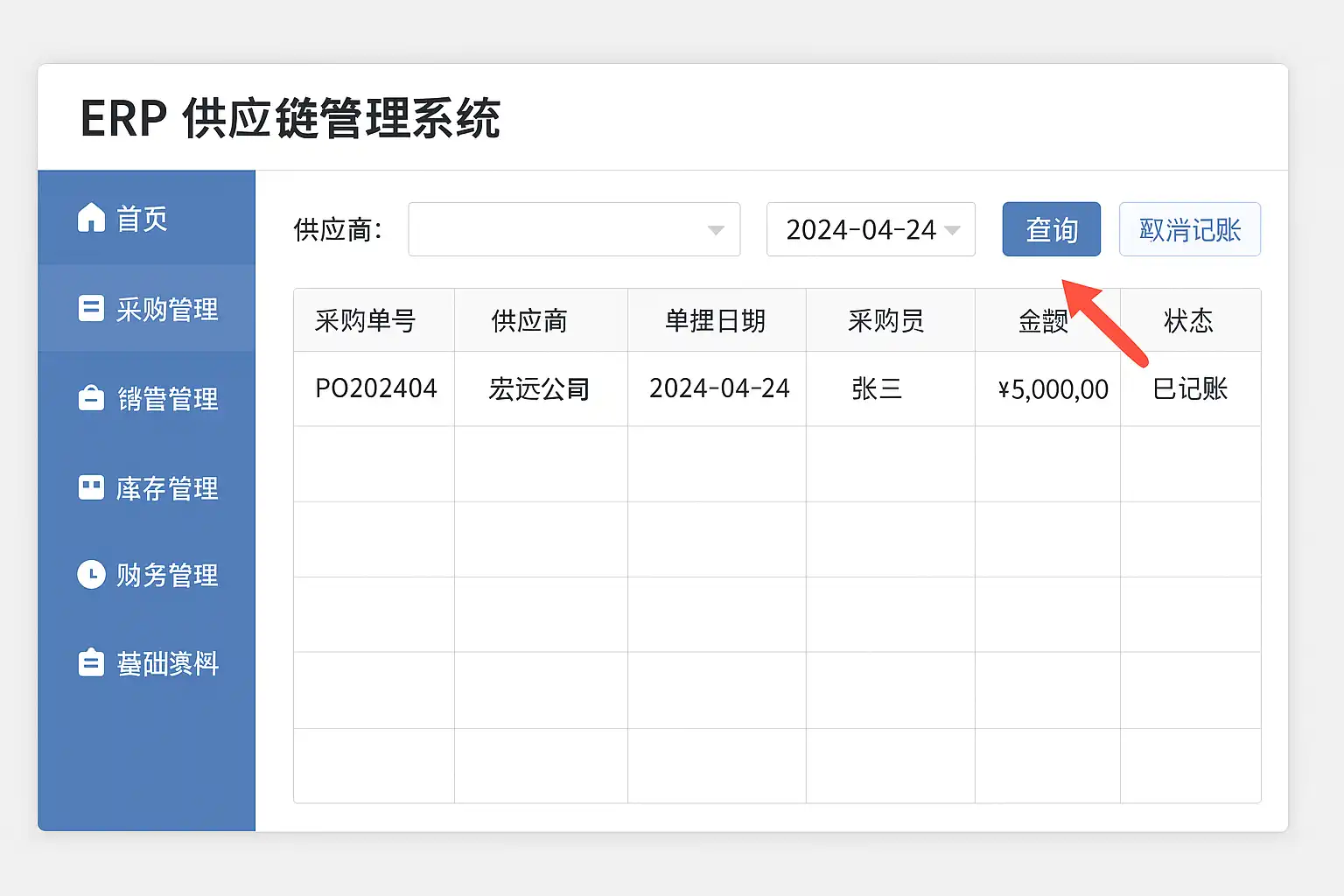 在ERP供应链管理系统中,快速撤销记账操作通常通过“取消记账”功能实现。具体步骤包括: