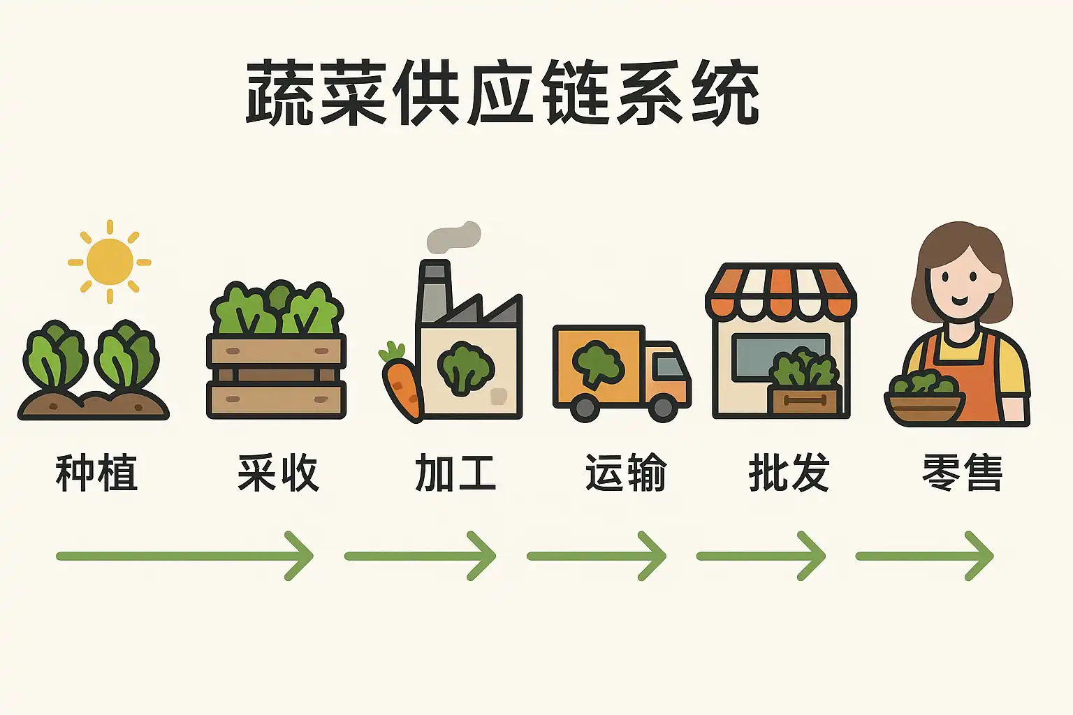 - 零售与消费者:最终将蔬菜销售给消费者。