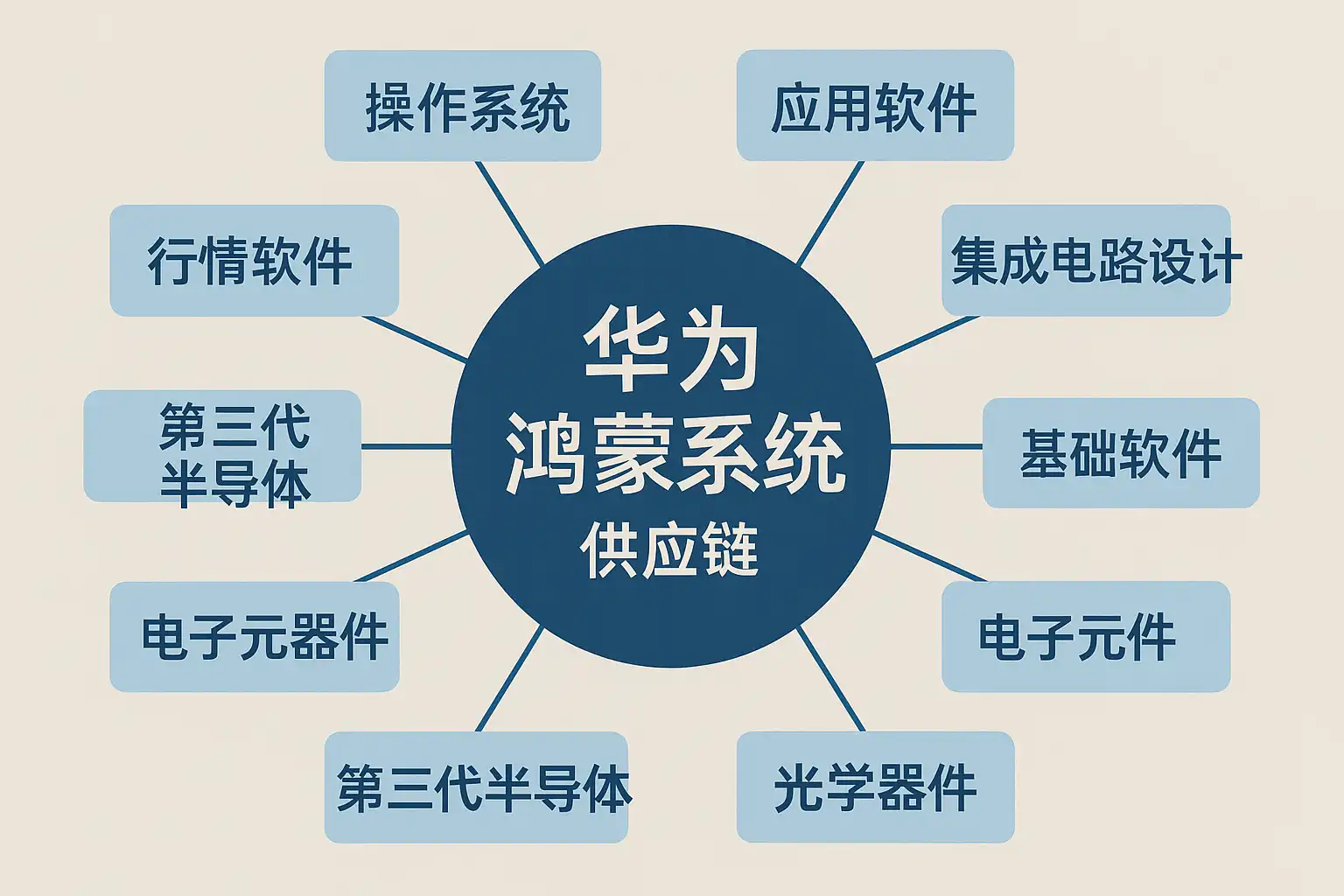 华为鸿蒙系统的供应链涵盖芯片设计、操作系统开发、终端制造及配套服务。关键厂商包括: