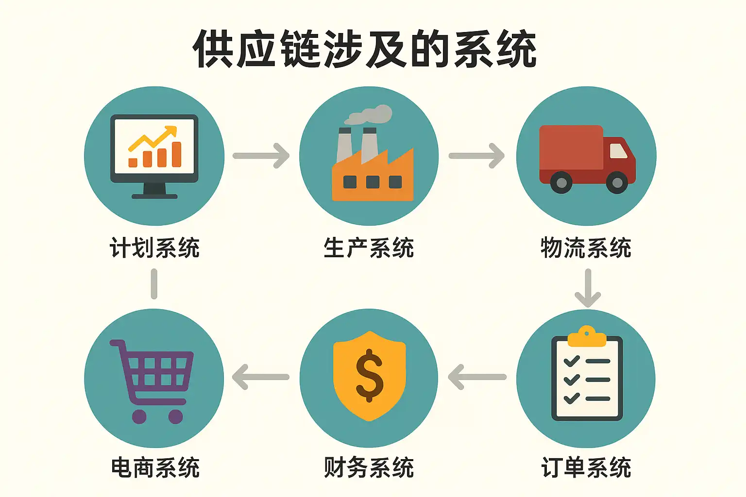 供应链系统通常由多个子系统协同组成,涵盖了从原材料采购、生产、库存、物流到销售与财务结算的全过程。其主要核心系统如下: