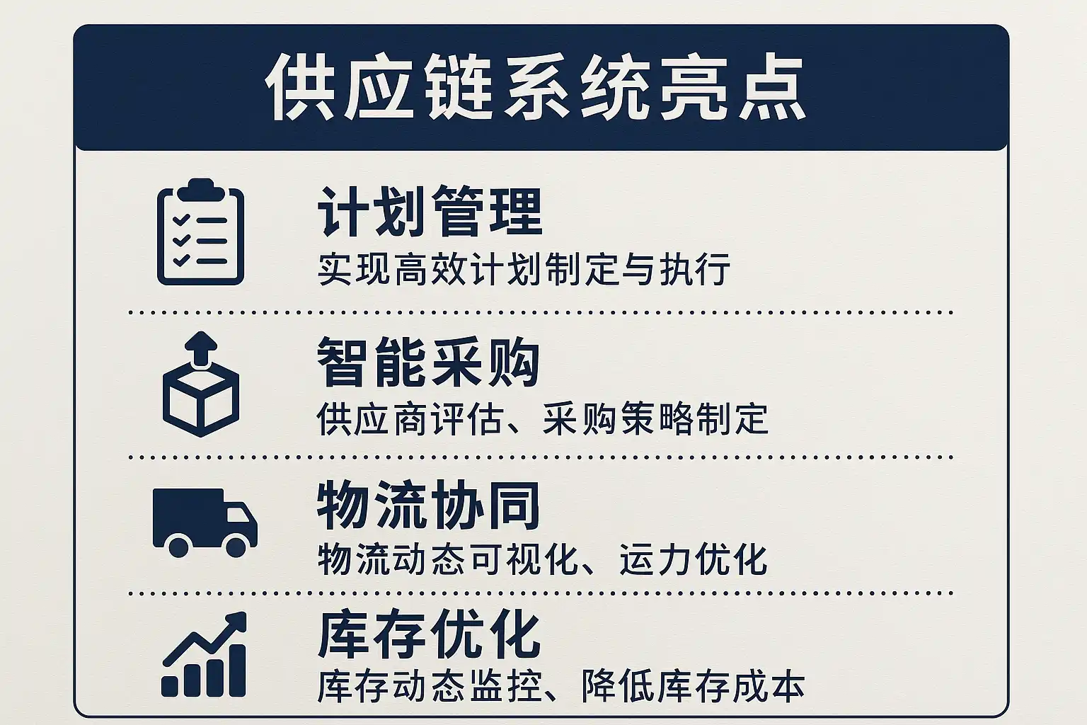 这些亮点共同构建了现代供应链系统的核心竞争力,推动企业实现数字化转型。