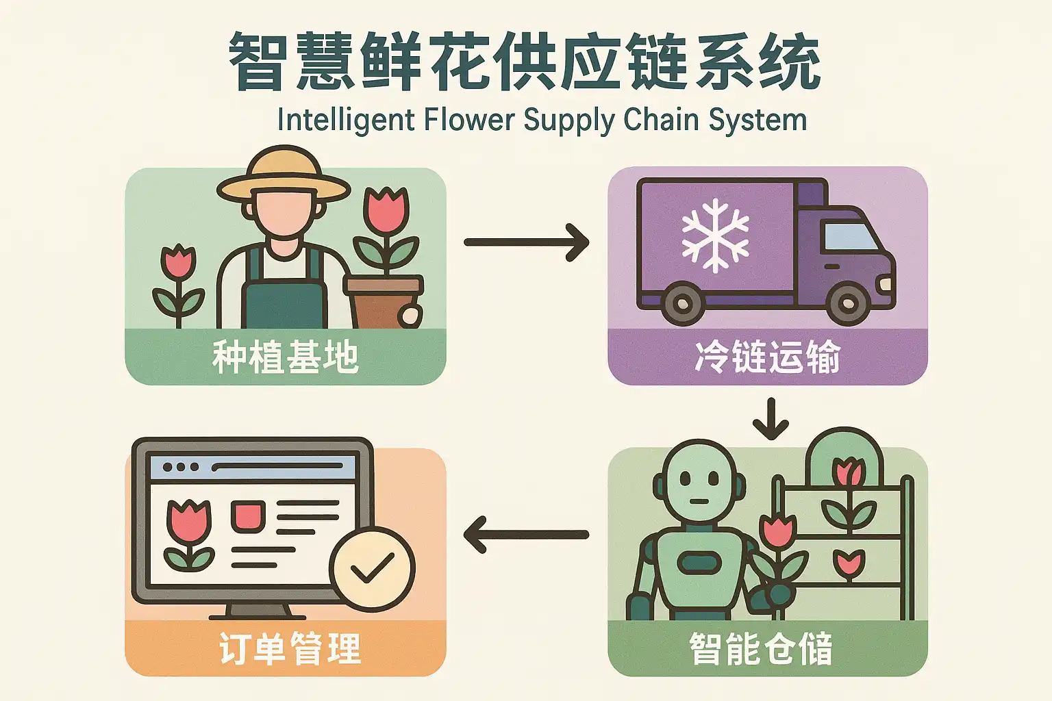 案例:某大型鲜花批发企业采用智慧供应链系统后,运输损耗率由10%降至3%,库存周转率提升30%。