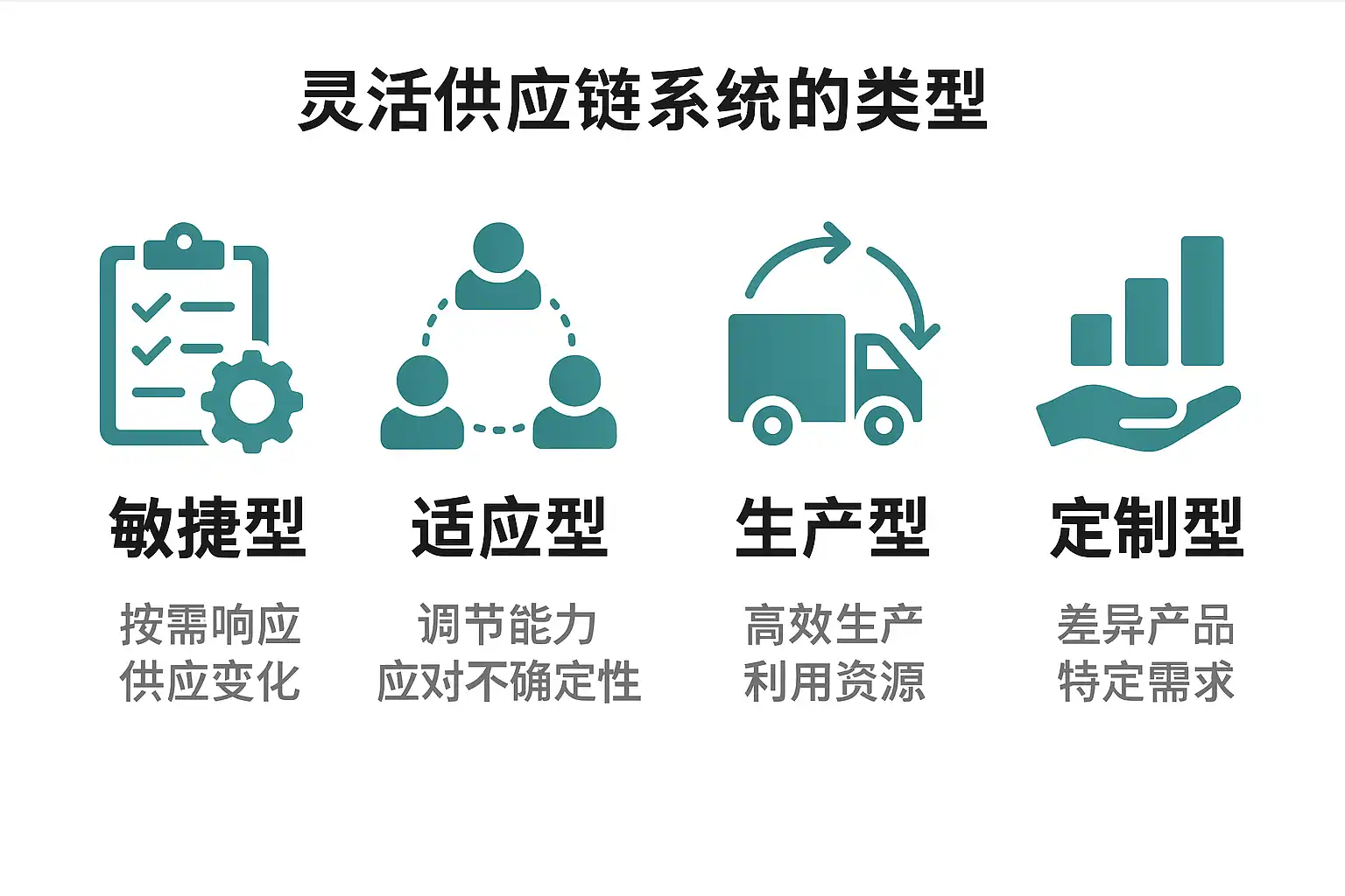 - 适应型供应链系统:具备较强的环境适应能力,能在市场或技术变化时快速调整,适合高科技行业。