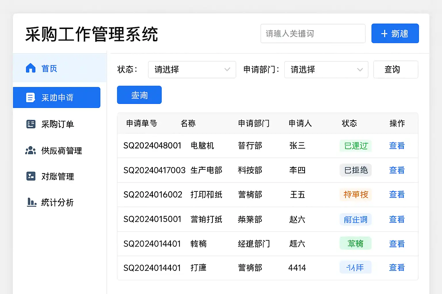 | 采购申请 | 员工提交采购需求,填写商品信息和数量 |