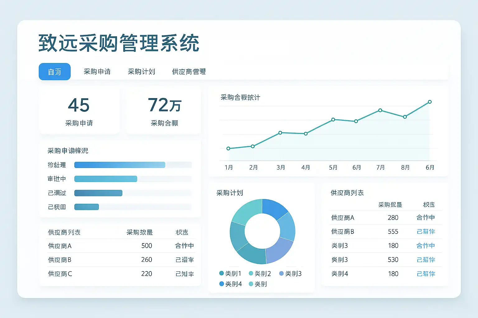 致远采购管理系统在采购流程自动化方面表现突出。通过流程引擎和智能表单,系统实现了采购活动的数字化、标准化和自动化,具体体现在以下几个环节: