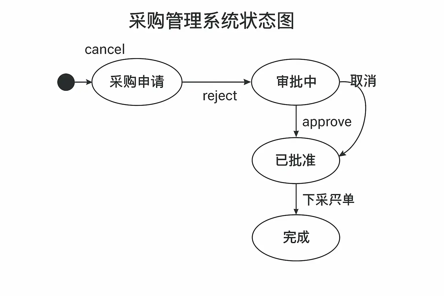- 触发事件/条件:在箭头旁标注触发转换的操作或条件,如“审批通过”、“到货验收合格”等。